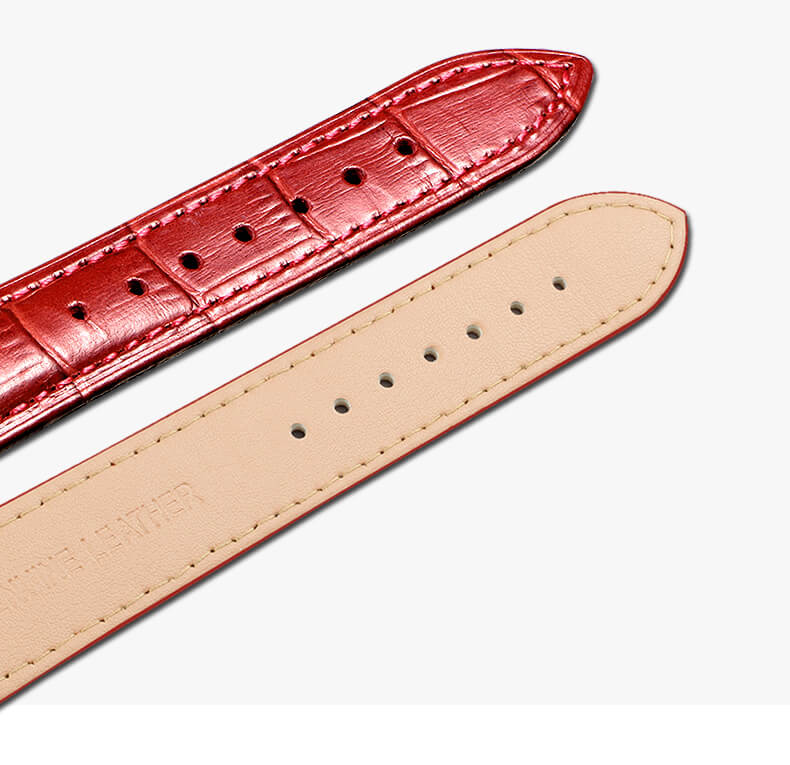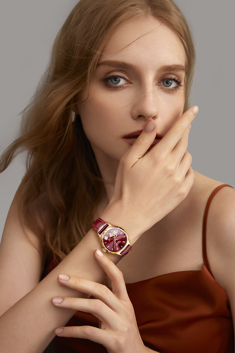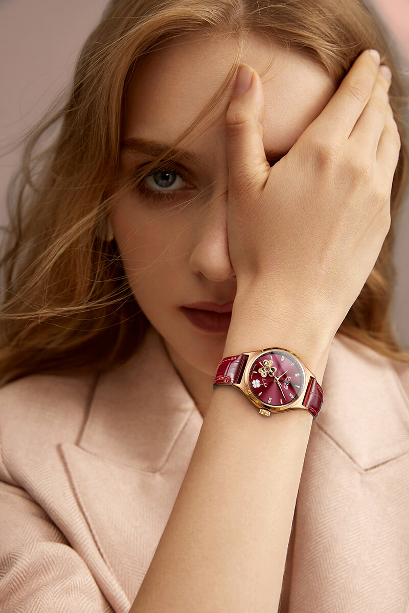 +Thiết kế hở tim phá cách kết hợp khéo léo với hoạ tiết hình chiếc lá gắn đá, viền mạ vàng PVD, cùng dây da màu đỏ thanh lịch sẽ khiến bạn nhận được sự "nể phục" vì gu chọn đồng hồ, cách chơi đồng hồ của mình !