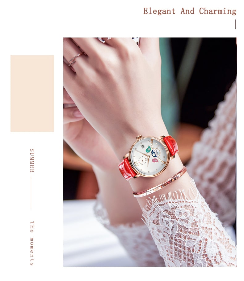 THÔNG SỐ SẢN PHẨM: Mã sản phẩm : K991-1 Giới tính : Nữ Kiểu máy : Automatic (Máy Cơ) Đường kính mặt : 35 mm Độ dày: 9 mm Chất liệu vỏ : Thép không