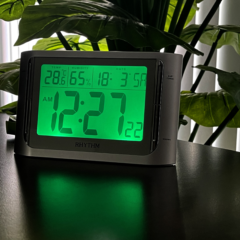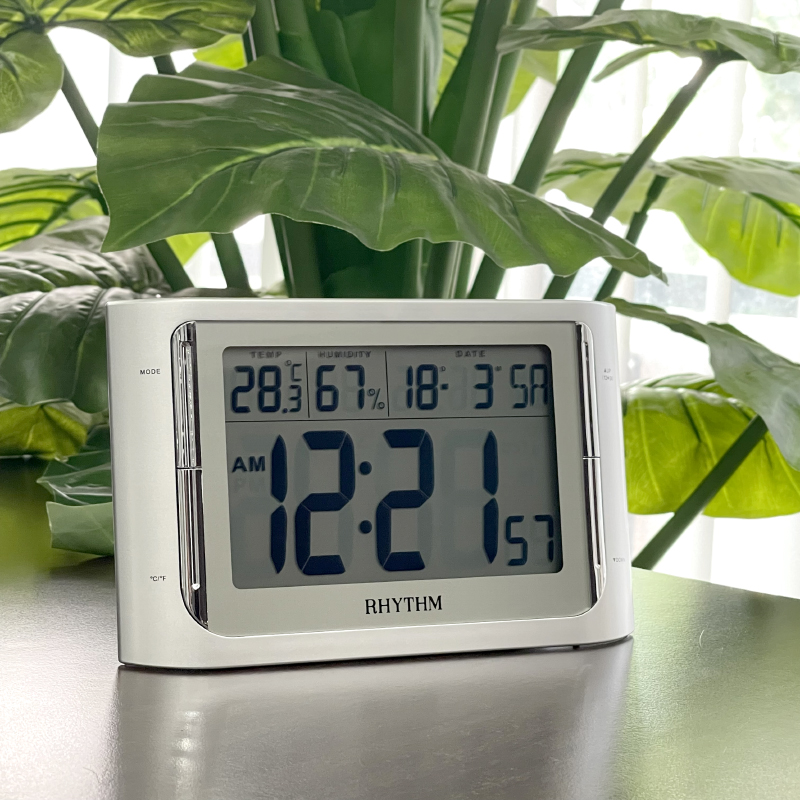 Đồng hồ mặt điện tử báo thức Rhythm LCT061NR19. Dùng 2 pin AA. Kích thước 18.6 x 11.5 x 5.0cm, 305g. Vỏ nhựa cao cấp sơn nhũ bạc / Mạ crom sáng bóng. Hiển thị lịch ngày tháng thứ, nhiệt độ, độ ẩm. Chỉnh giờ báo thức bằng tiếng bíp bíp, báo lập lại (Snooze). Màn hình có đèn led màu xanh hỗ trợ xem giờ trong tối, hiển thị lịch bằng 5 thứ tiếng Anh, Đức, Pháp, Ý, Tây Ban Nha.