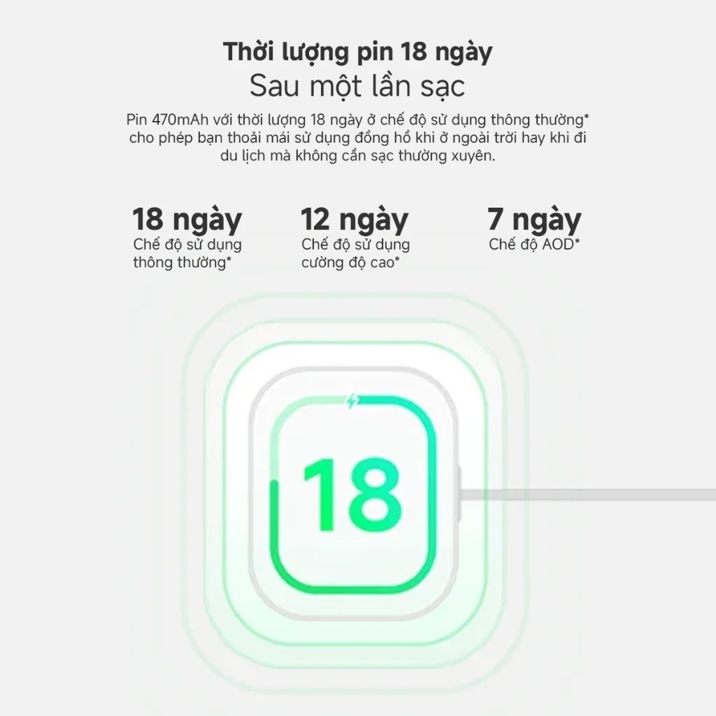 - Màn hình AMOLED 1.97" – Hiển thị sắc nét, dễ nhìn ngoài trời - Pin dùng đến 14 ngày – Thoải mái sử dụng cả tuần không cần sạc - 120+ chế độ thể