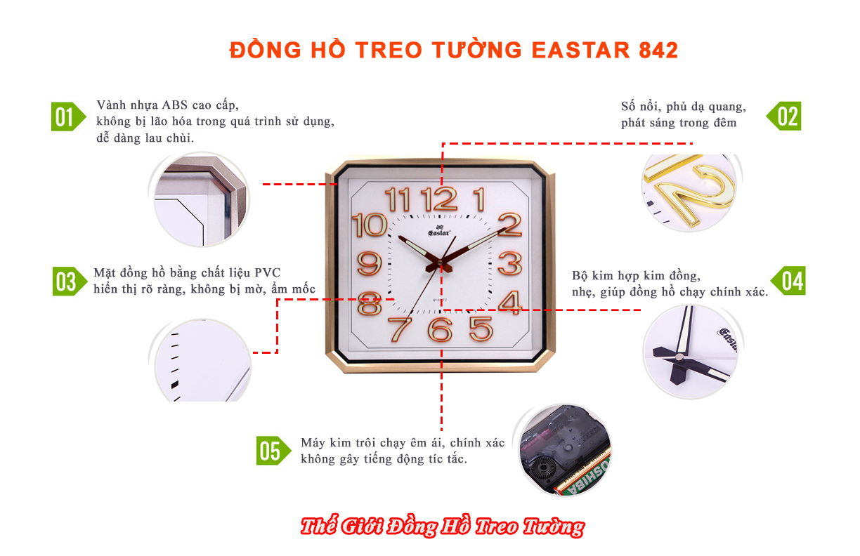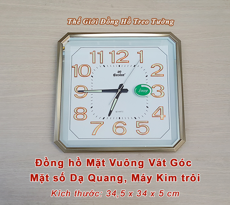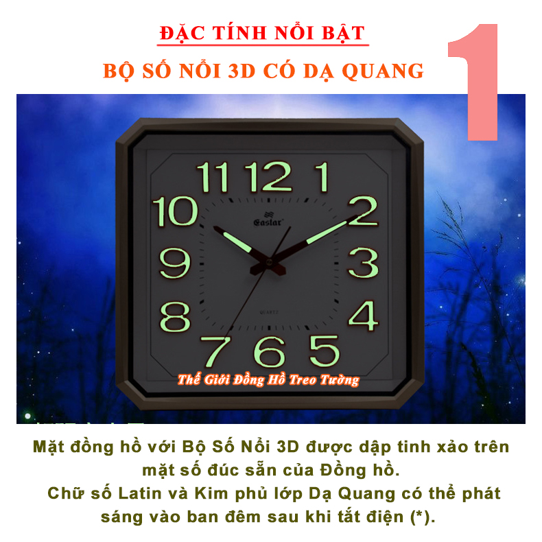1. ĐẶC ĐIỂM NỔI BẬT: - Đồng hồ Treo tường Cao Cấp EASTAR KIM TRÔI NHẬT có Dạ quang (*), mặt vuông vát góc, kích thước 34,5 x 34, dày 5 cm. - Kiểu dáng