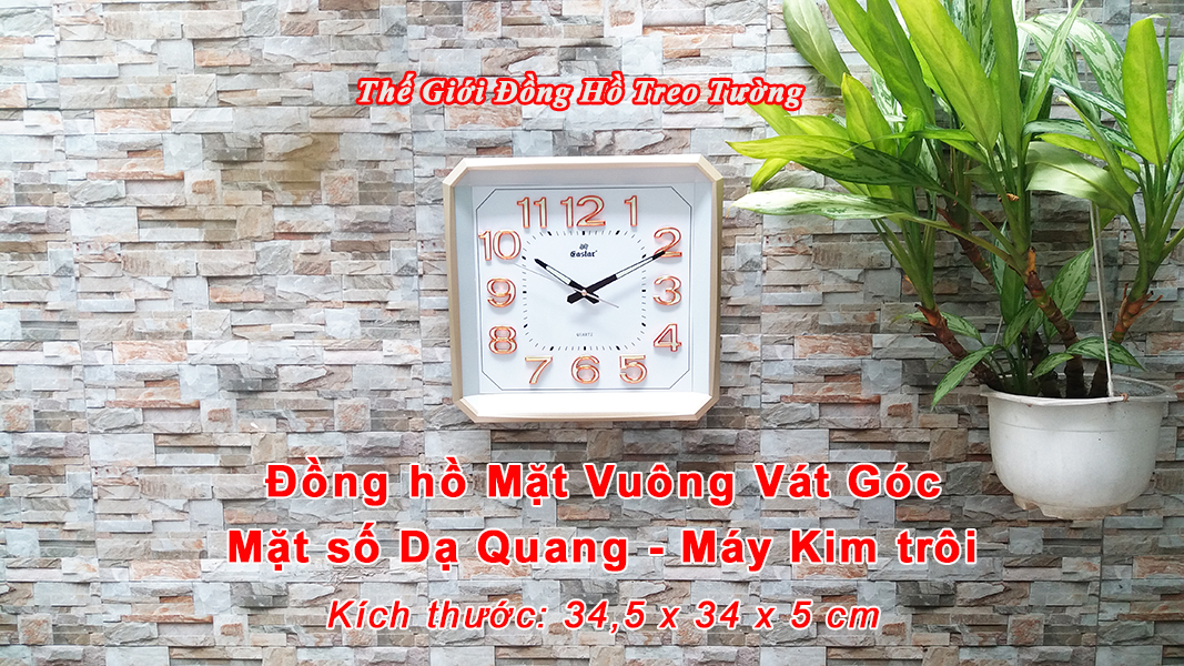1. ĐẶC ĐIỂM NỔI BẬT: - Đồng hồ Treo tường Cao Cấp EASTAR Kim Trôi Nhật có Dạ quang (*), mặt vuông vát góc, kích thước 34,5 x 34, dày 5 cm. - Kiểu