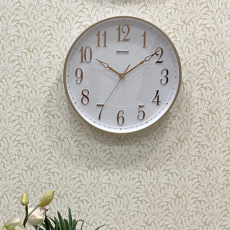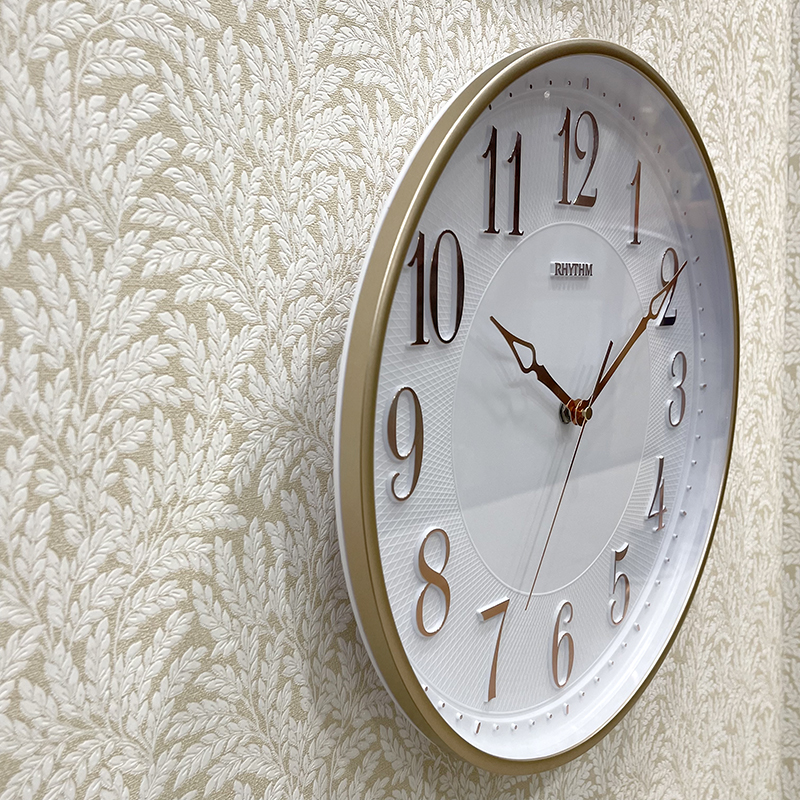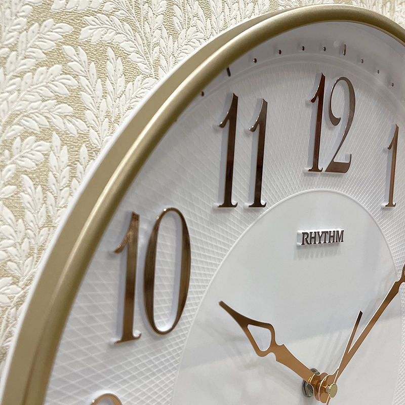 Đồng hồ treo tường Nhật Bản Rhythm CMG876NR18, dùng pin (AA x 1), vỏ nhựa màu vàng / kết hợp mạ vàng sang trọng. Kích thước 31.5 x 4.5cm, trọng lượng 625g. Máy kim trôi