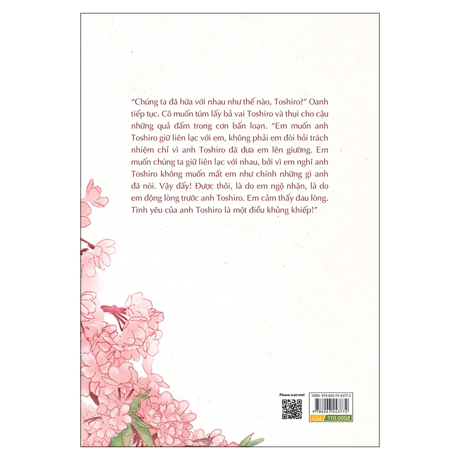 “Chúng ta đã hứa với nhau như thế nào,Toshiro ?” Oanh tiếp tục. Cô muốn túm lấy bả vai Toshiro và thụi cho cậu những quả đấm trong cơn bấn loạn. “Em muốn anh Toshiro giữ liên lạc với em, không phải em đòi hỏi trách nhiệm chỉ vì anh Toshiro đã đưa em lên giường. Em muốn chúng ta giữ liên lạc với nhau, bởi vì em nghĩ anh Toshiro không muốn mất em như chính những gì anh đã nói. Vậy đấy ! Được thôi, là do em ngộ nhận, là do em động lòng trước anh Toshiro. Em cảm thấy đau lòng. Tình yêu của anh Toshiro là một điều khủng khiếp !”
