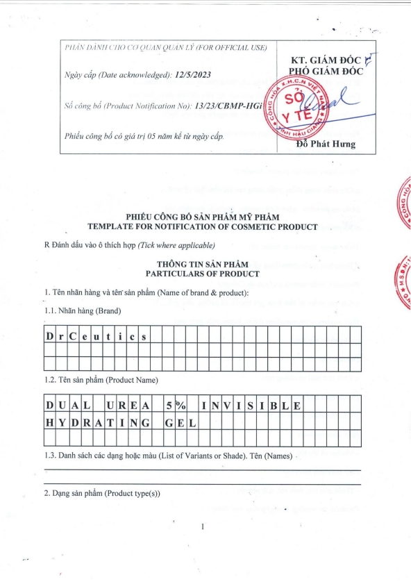• Thương hiệu: DrCeutics • Xuất xứ: Việt Nam • Dung tích: 50g DRCEUTICS Gel Dưỡng Ẩm Và Phục Hồi Da Dual Urea 5% Invisible Hydrating Gel (35g) là một sản phẩm dưỡng ẩm, cấp