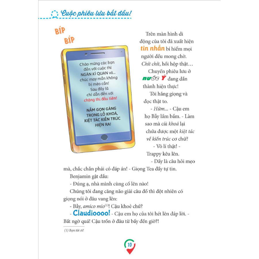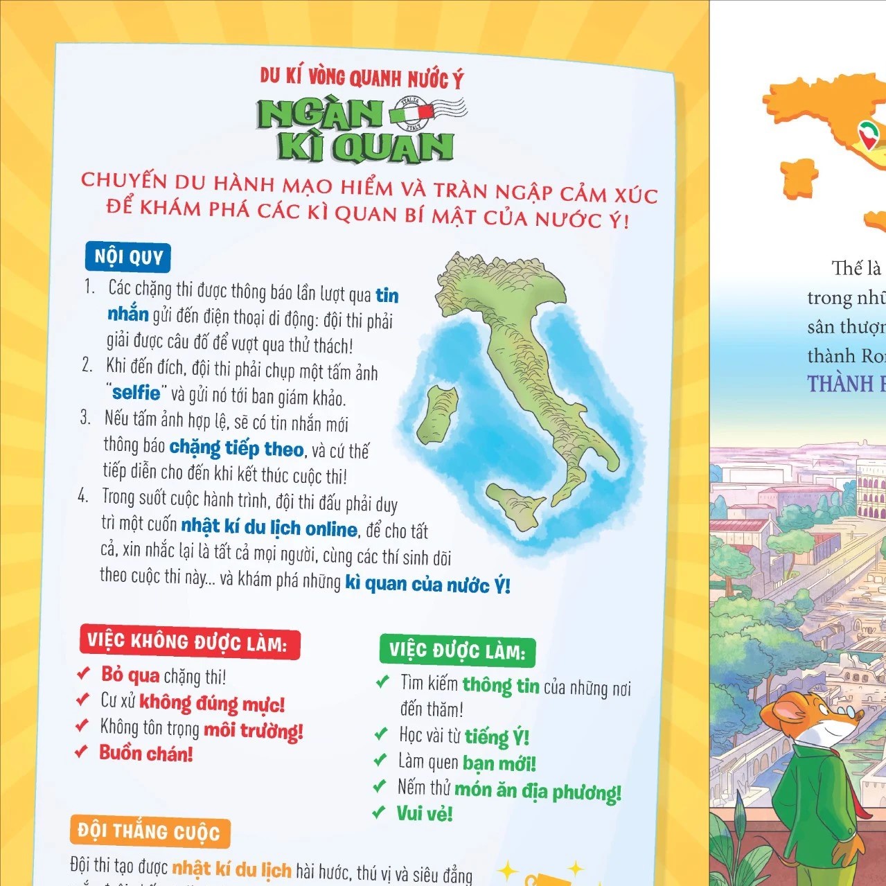 Mua tại TiktokCác bạn đọc Gặm Nhấm thân mến, Hãy cài dây an toàn và chuẩn bị sẵn sàng nào: một chuyến đi tuyệt diệu đang chờ đón chúng ta. Lên đường cùng chúng tôi nhé! Đấy là một buổi sáng mùa hạ đẹp trời, tôi - Geronimo Stilton - đang ngồi trên máy bay, sẵn sàng cho một kì nghỉ thư thái với gia đình. Nhưng… đấy không hẳn là một kì nghỉ, mà còn là khởi đầu của một chuyến đi đáng nhớ vô cùng! Mời các bạn cùng tham gia vào chuyến phiêu lưu kì thú băng qua các vùng đất và tìm hiểu nền văn hoá của nước Ý: Một đất nước của NGÀN KÌ QUAN!