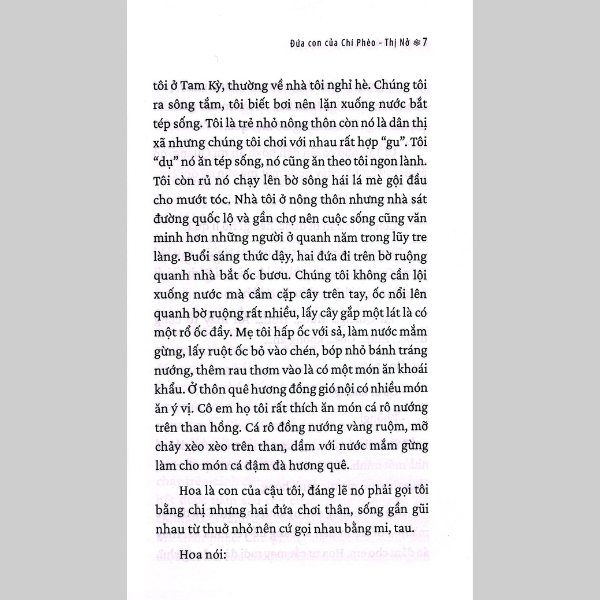 "Cậu Thời đi cùng cụ Ba đến cuối làng. Con đường làng quanh co với khóm chuối, bờ tre. Những sân nhà có giếng nước, giàn mướp trổ hoa vàng tươi. Những đụn rơm chất cao như cái nấm khổng lồ thoang thoảng mùi quê hương. Đó là mùi rơm rạ mới, mùi lá khô, mùi hương cau, hương bưởi hòa quyện tạo nên một mùi rất đặc biệt chỉ ở nông thôn mới có. Mùi hương gợi nhớ... Cậu hồi tưởng những kỷ niệm thời thơ ấu. Lúc nhỏ, cậu được mẹ Hai dắt đi vào làng mua trái cây. Cậu rất thích những buổi chiều lộng gió, cùng mẹ tung tăng đi hóng mát... Mẹ Hai yêu thương cậu, chăm sóc cậu một cách nâng niu như người ta thường nói: “Nâng như nâng trứng, hứng như hứng hoa". Cậu muốn gì được nấy. Tuy nhiên, cậu vẫn thấy thiếu thiếu một cái gì mà cậu mơ hồ không hiểu nổi.”