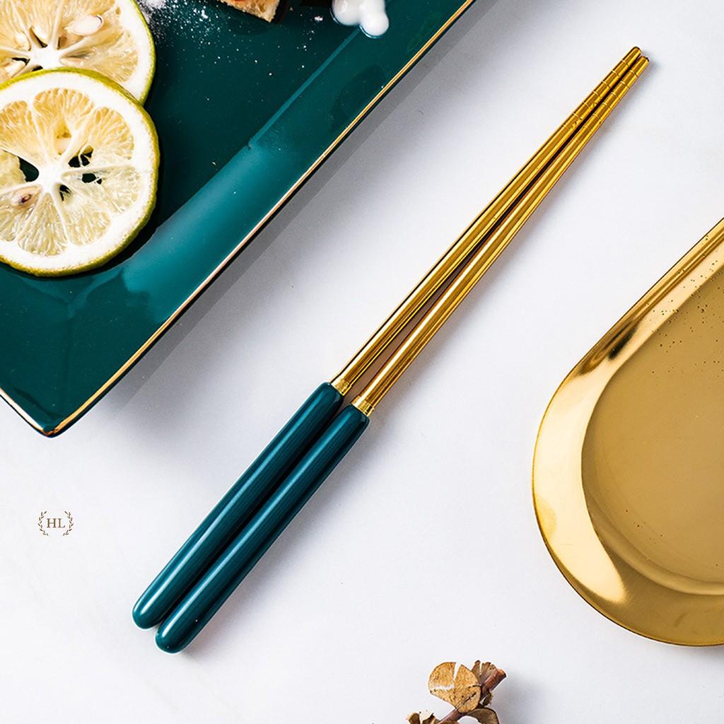 Bộ đồ ăn sứ xanh ngọc lục bảo gồm: đũa, thìa lớn, nĩa lớn, thìa dài (Thìa khuấy) Màu xanh ngọc lục bảo theo phong cách quý tộc Bắc Âu, mang lại sự đơn giản
