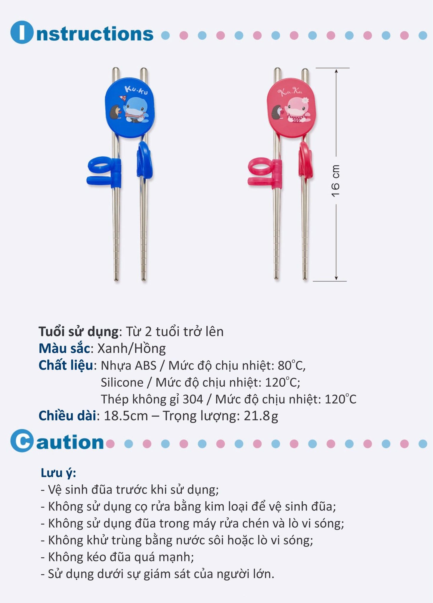 - Đũa thiết kế in hình chú vịt KuKu đáng yêu và 2 màu sắc xanh/hồng dễ thương kích thích thị giác, bé thích hơn khi sử dụng. Thành phần: Thép không gỉ 304, nhựa ABS và silicone