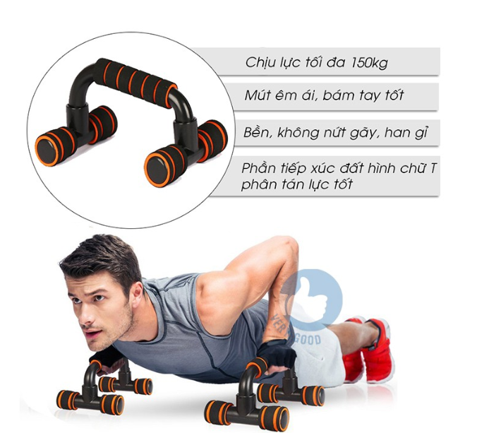 Cặp dụng cụ chống đẩy (tay cầm hít đất) là một dụng cụ hỗ trợ chống đẩy vô cùng hiệu quả. Khi thực hiện, phần thân trên cơ thể được hạ xuống sâu hơn so