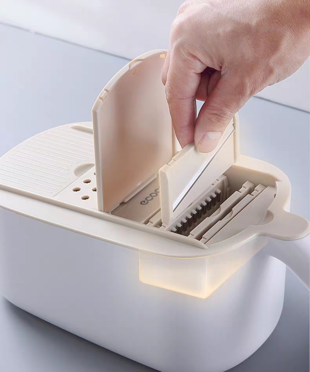 Khi cắt, hộp đựng có chức năng giữ lại các miếng cắt và cũng là hộp đựng các thực phẩm khác.