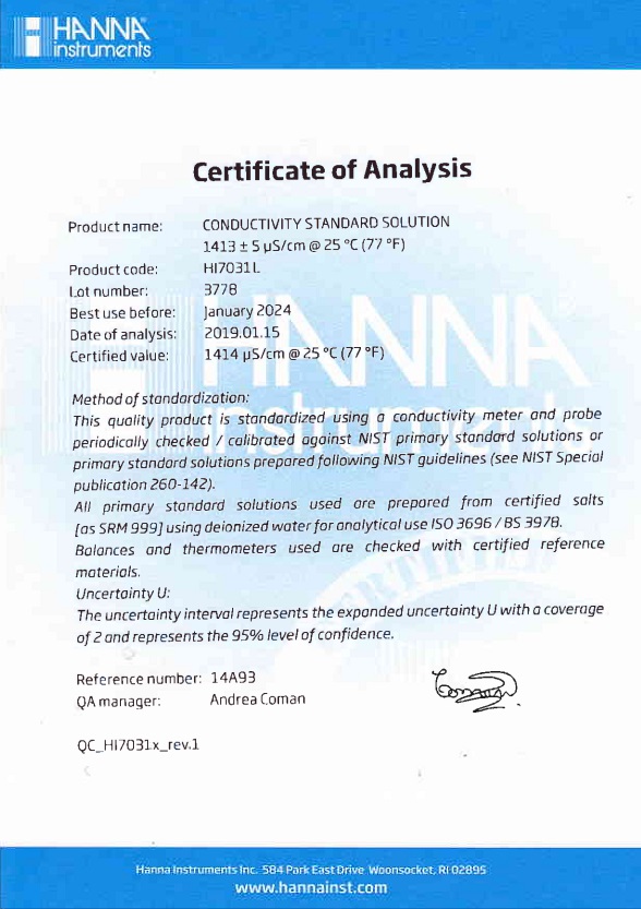 Mua tại TiktokHI7033L là một dung dich hiệu chuẩn 1413 µS/cm (1.41 mS/cm) dạng chai 500mL chất lượng cao NIST và được cung cấp kèm Chứng nhận Phân Tích (COA). Dung dịch hiệu chuẩn có số lô sản xuất và ngày hết hạn ghi rõ trên nhãn và nắp có vòng bảo vệ để đảm bảo chất lượng. Dung dịch chuẩn có thể dùng cho bất kỳ máy đo hãng nào khác có điểm hiệu chuẩn tại 1413 µS/cm (1.41 mS/cm) Vì EC thay đổi khi nhiệt độ thay đổi, trên thân chai có in bảng giá trị EC tương ứng với nhiệt độ thích hợp