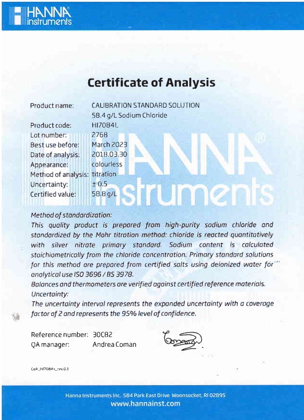 ✨Dung Dịch Chuẩn Độ Mặn Natri Clorua 58.4 g/L NaCl Để Kiểm Tra Hoặc Hiệu Chuẩn Bất Kỳ Máy Đo độ mặn nào tại điểm 58.4 g/L, 500mL, HANNA HI7084L - Kèm COA và SDS