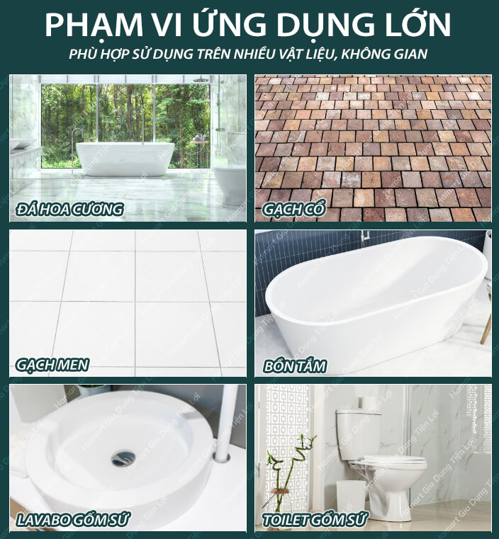 - Ứng dụng trên bề mặt gạch tráng men, gạch bóng, bề mặt các thiết bị vệ sinh bằng sứ như lavabo, bồn cầu...
