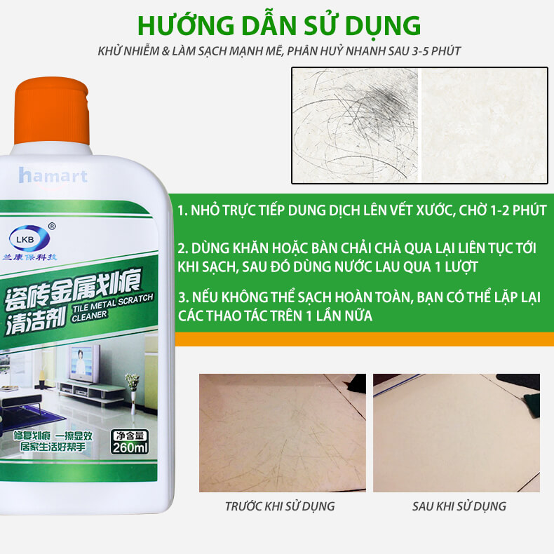 Mua tại TiktokDung Dịch Làm Sạch Vết Xước Sàn Gạch Men Lát Nền Nhà LKB 260ml - TẨY CỰC MẠNH, AN TOÀN, KHÔNG HẠI GẠCH - ĐA DẠNG BỀ MẶT GẠCH MEN, BỒN CẦU, BỒN TẮM Sàn nhà nhiều vết xước ảnh hưởng nghiêm trọng đến mỹ quan? ĐỪNG VỘI thay thế gạch mới, hãy sử dụng ngay dung dịch làm sạch vết xước sàn LKB để thấy hiệu quả vượt trội ! ***LƯU Ý: Sản phẩm có tác dụng tẩy vết xước đen trên bề mặt - Không có tác dụng Lấp Đầy các vết nứt, vết xước sâu, lún lõm ... ĐẶC ĐIỂM NỔI BẬT: