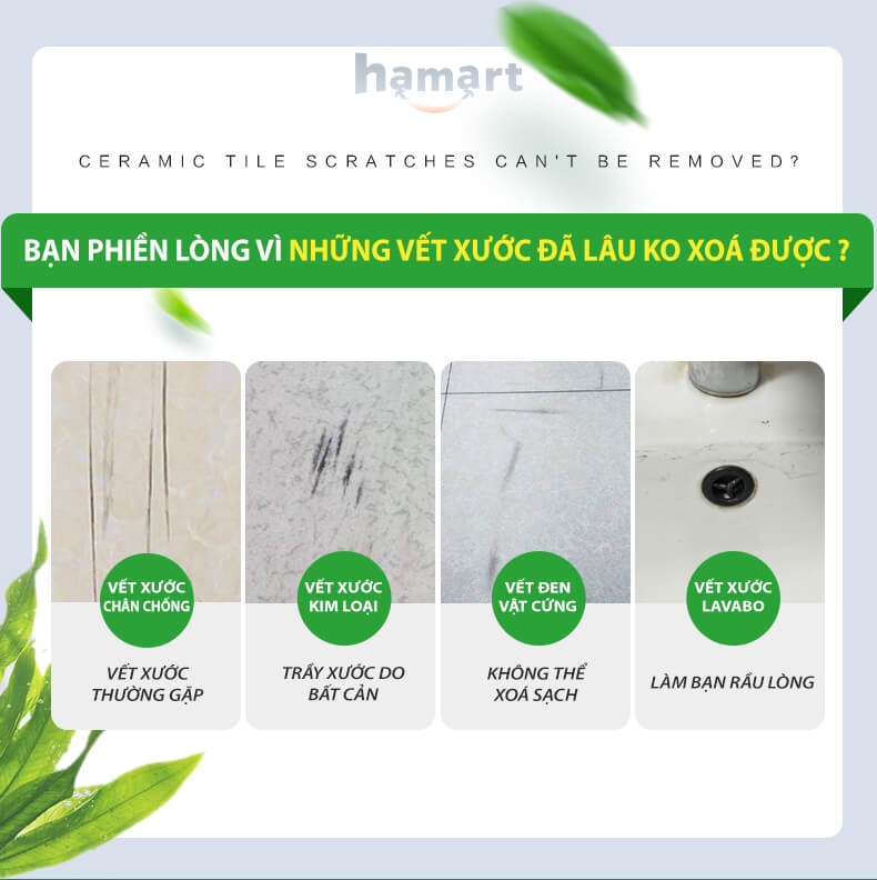 - Làm sạch hoặc làm mờ nhanh chóng các vết trầy xước đen trên nền gạch do kim loại, gỗ, nhựa, kính, chân cửa, vết xước chân chống xe máy... gây ra