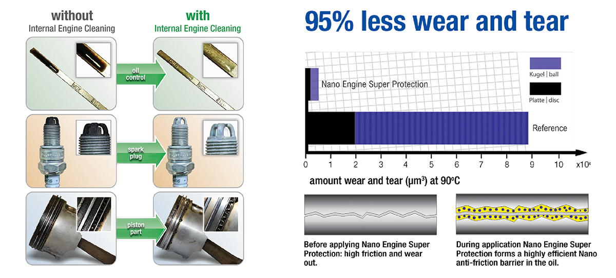Dung dịch nano bảo vệ động xe cơ ô tô Bluechem BC33181E có tác dụng tạo một lớp lót trong lòng động cơ. Sản phẩm giống như 1 lớp phin mỏng bao phủ lấy bề mặt kim loại của toàn bộ lòng động cơ xe bao gồm ống xylanh, vòng piston, trục khủy và bánh răng.