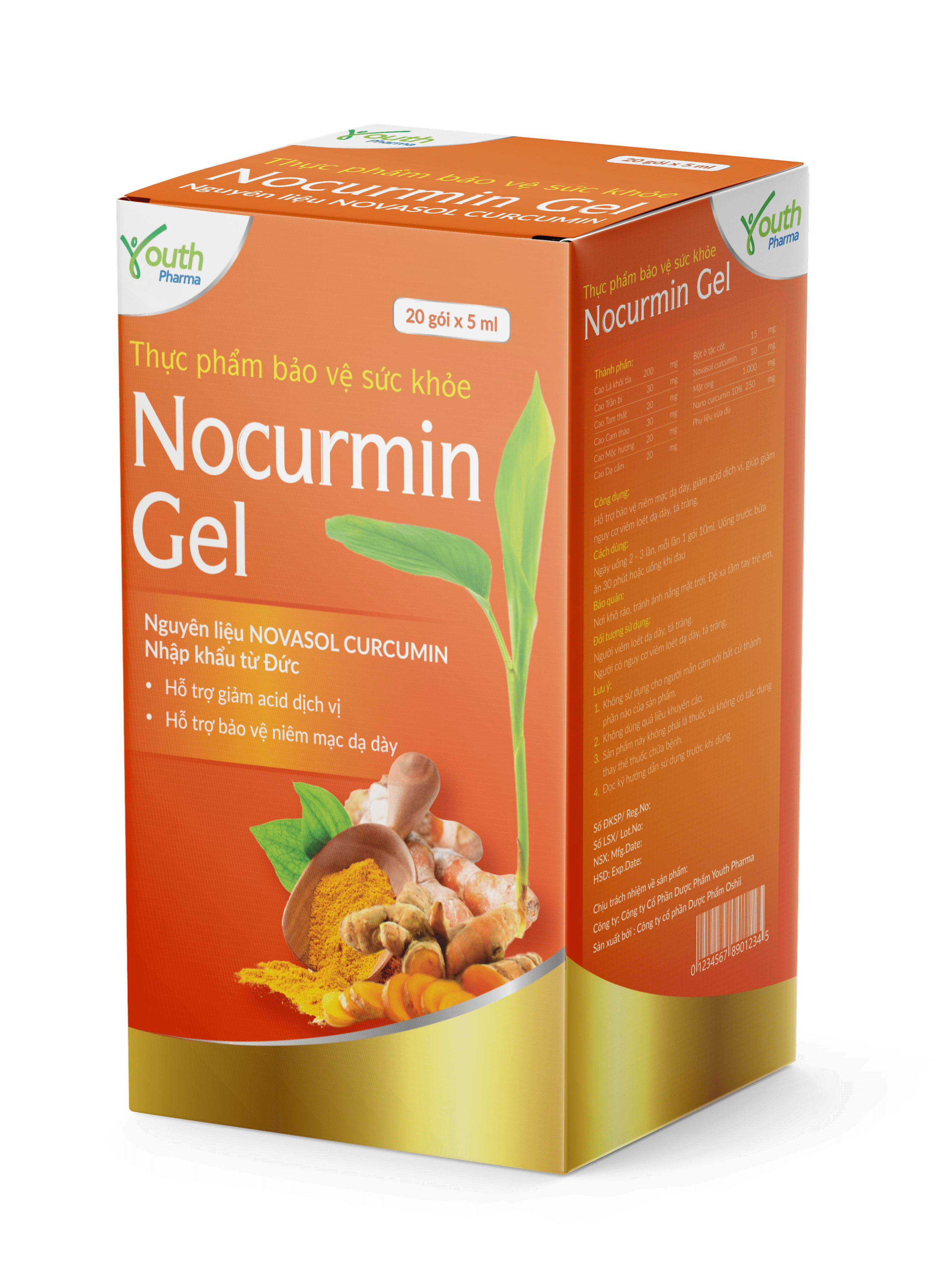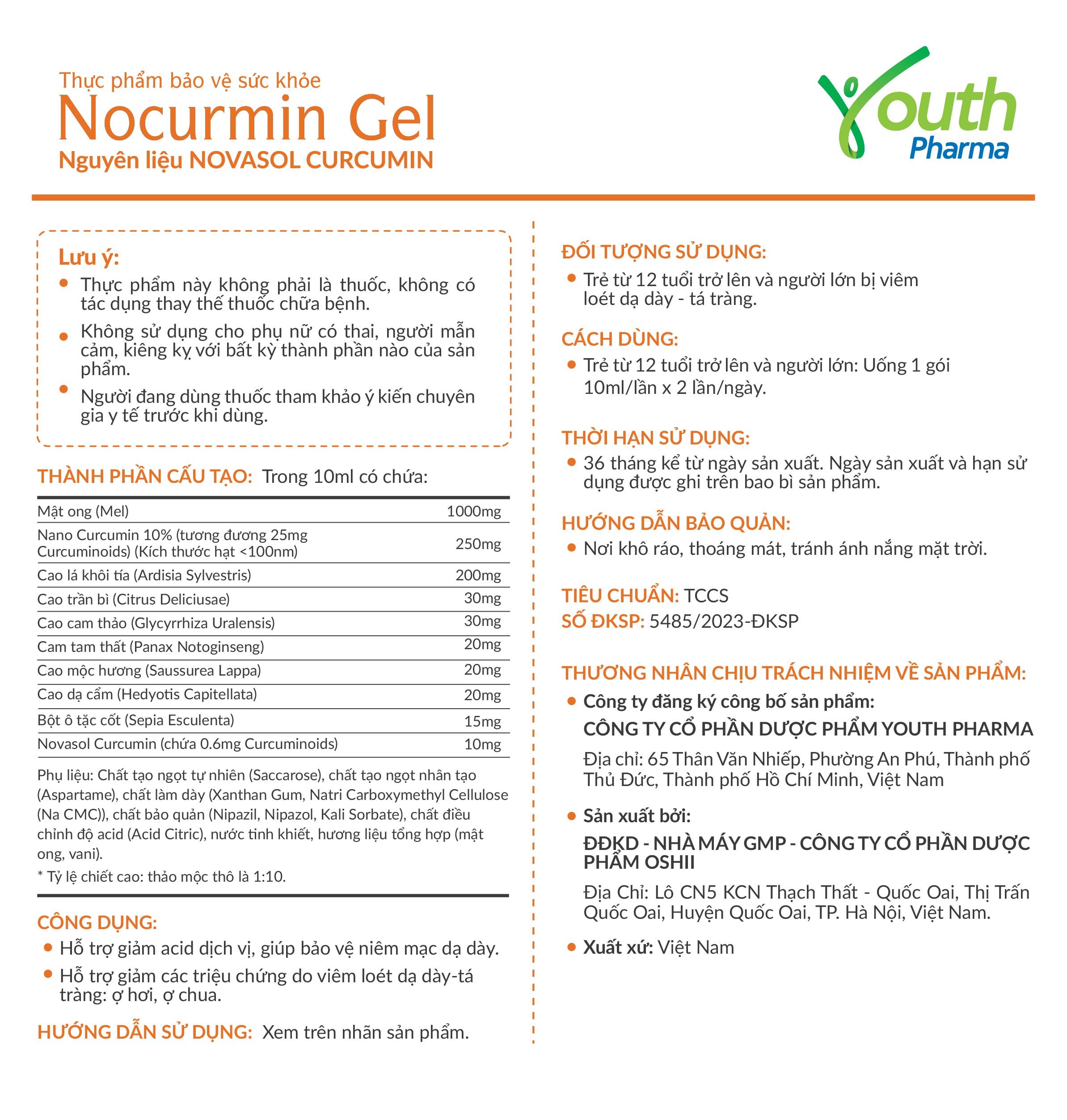 - Thành phần NOCURMIN GEL Mật Ong (Mel) 1000mg, Nano Curcumin 10% (tương đương 25mg Curcuminoids) (Kích Thước Hạt <100nm) 250mg, Cao Lá Khôi Tía (Ardisia Sylvestris) 200mg, Cao Trần Bì (Citrus Deliciusae) 30mg, Cao Cam Thảo (Glycyrrhiza Uralensis) 30mg, Cam Tam Thất (Panax Notoginseng) 20mg, Cao Mộc Hương (Saussurea Lappa) 20mg, Cao Dạ Cẩm (Hedyotis Capitellata) 20mg, Bột Ô Tặc Cốt (Sepia Esculenta) 15mg, Novasol Curcumin (chứa 0.6mg Curcuminoids) 10mg. Phụ liệu: Chất tạo ngọt tự nhiên (Saccarose), chất tạo ngọt nhân tạo (Aspartame), chất làm dày (Xanthan Gum, Natri Carboxymethyl Cellulose (Na CMC)), chất bảo quản (Nipazil, Nipazol, Kali Sorbate), chất điều chỉnh độ acid (Acid Citric), nước tinh khiết, hương liệu tổng hợp (mật ong, vani).