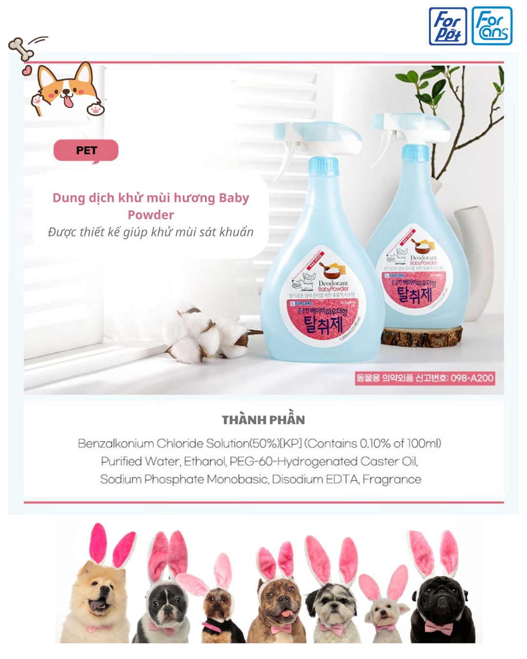 - - Dung Dịch Xịt Khử Mùi Khu Vực Hương Baby Powder Forcans 8809058111896 (1000ml) giúp loại bỏ một cách chuyên nghiệp các mùi hôi phát sinh từ động vật nuôi. - Sử dụng sản