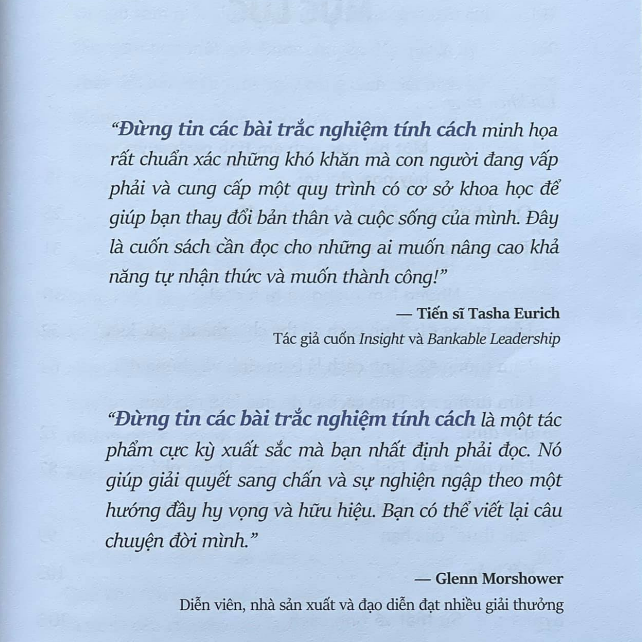 Tuy nhiên, trong cuốn sách best-seller "Personality isn't permanent" được xuất bản dưới tựa đề "Đừng tin các bài trắc nghiệm tính cách", tác giả Benjamin Hardy "đã minh họa rất chuẩn xác những khó khăn mà con người vấp phải và cung cấp một quy trình có cơ sở khoa học để giúp thay đổi bản thân và cuộc sống của mình", Ts Tashsa Eurich, tác giả Insight nhận định.