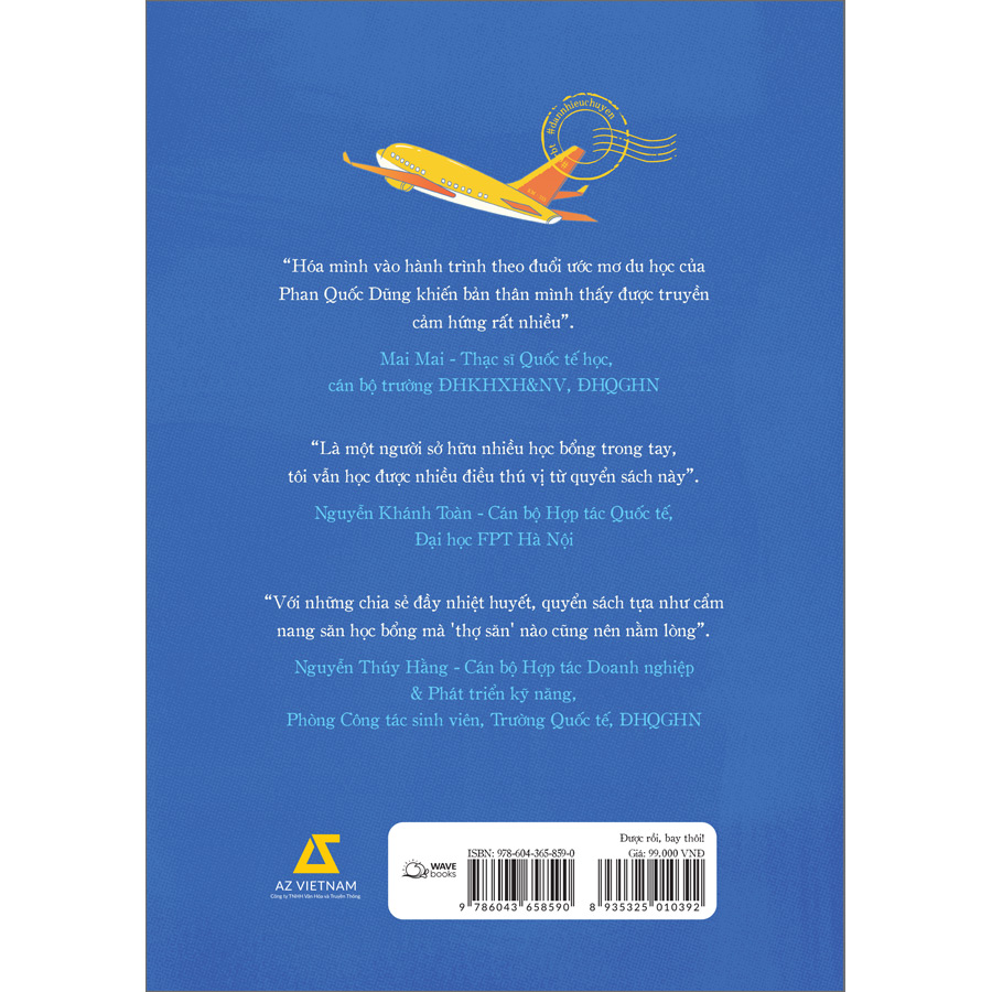 Được rồi, bay thôi! - cuốn sách được chấp bút bởi Phan Quốc Dũng, người đã dành học bổng toàn phần Erasmus Mundus do EU tài trợ, sẽ như là một cuốn cẩm nang thu nhỏ tất tần tật những điều mà một người có ý định đi du học cần biết. Thông qua sách, người đọc sẽ nắm được tiến trình chuẩn bị cho việc du học, bao gồm lựa chọn các loại hình du học, lập kế hoạch săn học bổng, những lưu ý khi học tập và sinh sống ở nước ngoài,… cũng như có một cái nhìn đa chiều hơn về cuộc sống xa xứ qua câu chuyện của các du học sinh.