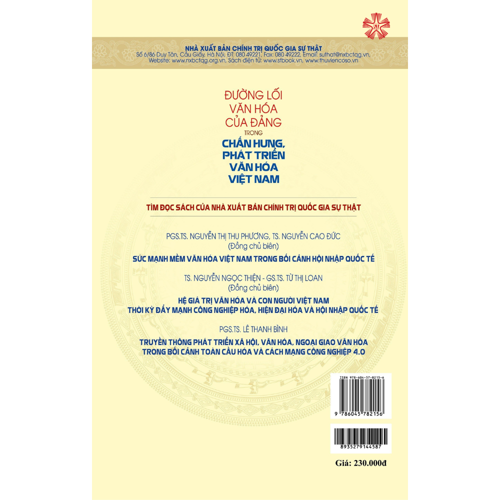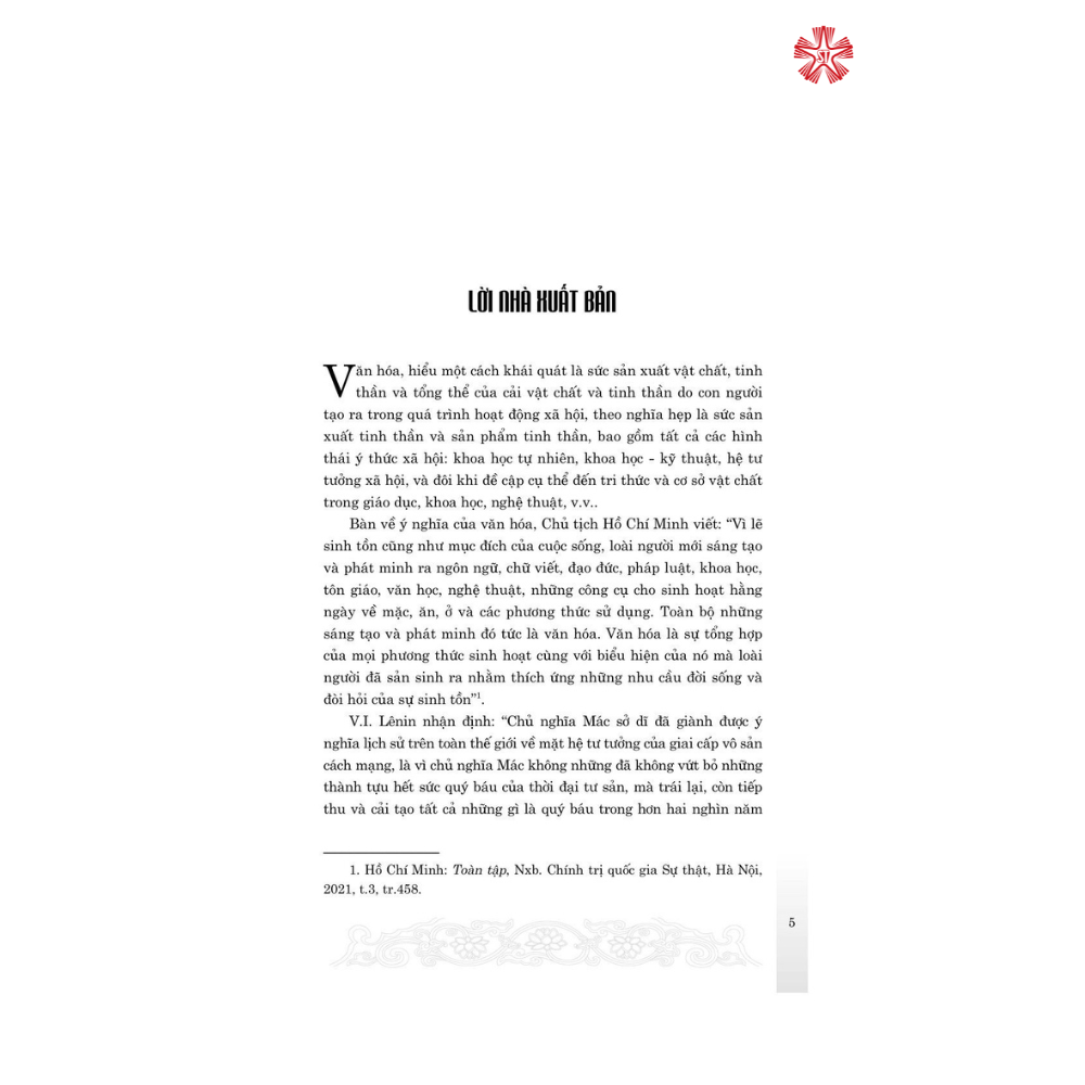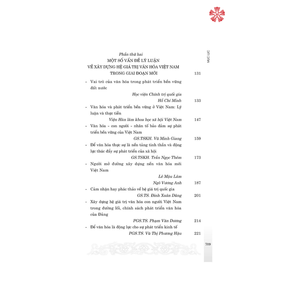 Nội dung gồm các văn bản chỉ đạo mới của Đảng, Nhà nước về chủ trương, đường lối văn hóa trong bối cảnh mới; toàn văn bài viết, phát biểu của Tổng Bí thư Nguyễn Phú Trọng tại Hội nghị văn hóa toàn quốc, tháng 11/2021. Cùng với các bài viết lý luận về xây dựng hệ giá trị văn hóa Việt Nam trong giai đoạn mới và việc tổ chức thực hiện ở một số cơ quan, bộ, ngành, địa phương…