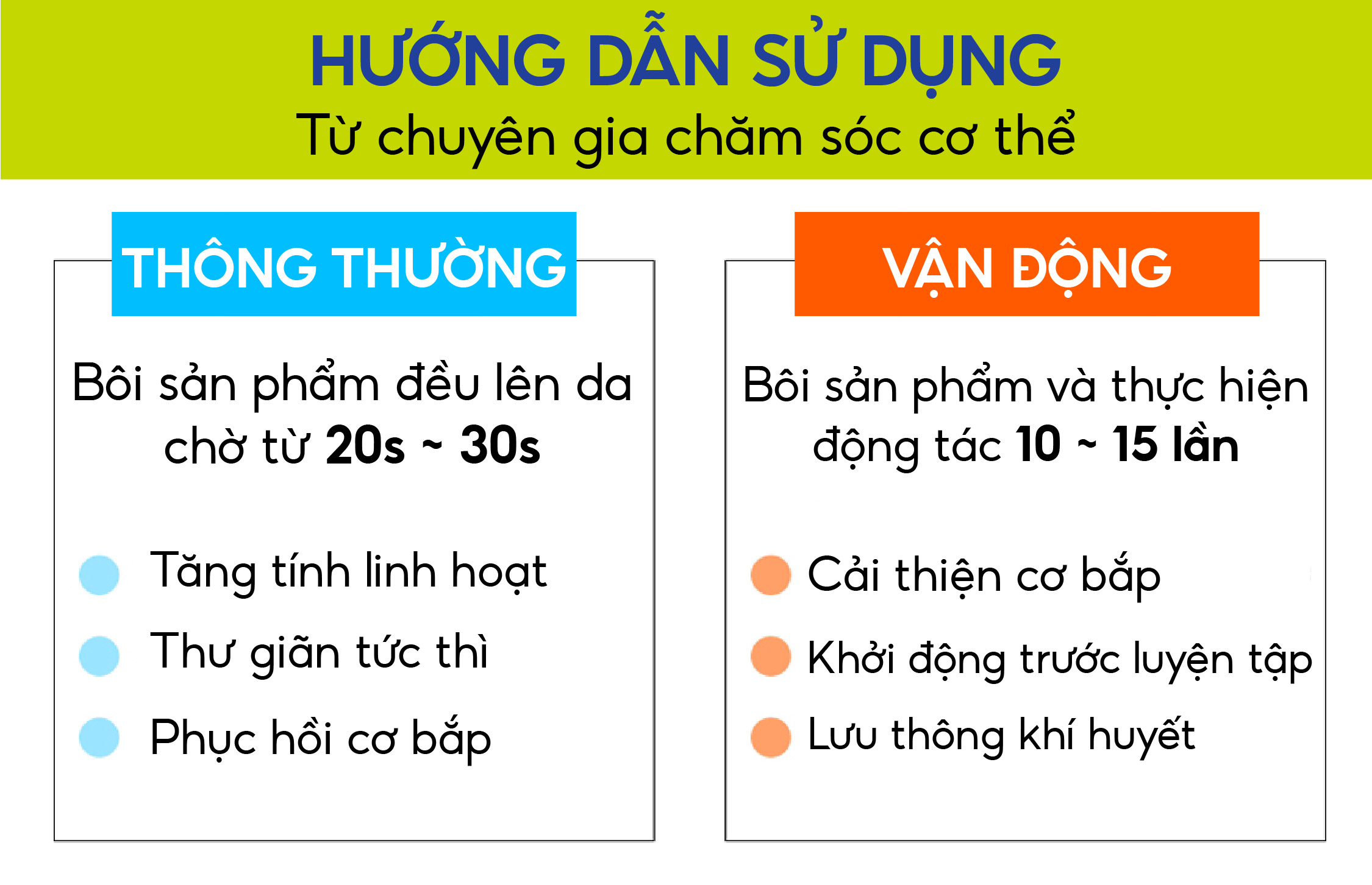 - Có thể dùng hàng ngày hoặc trước/trong/sau khi tập luyện thể thao và thi đấu, ngoài ra, nên thoa loại sữa dưỡng thể này lên toàn bộ cơ thể sau khi tắm để đảm bảo bạn có một giấc ngủ ngon.