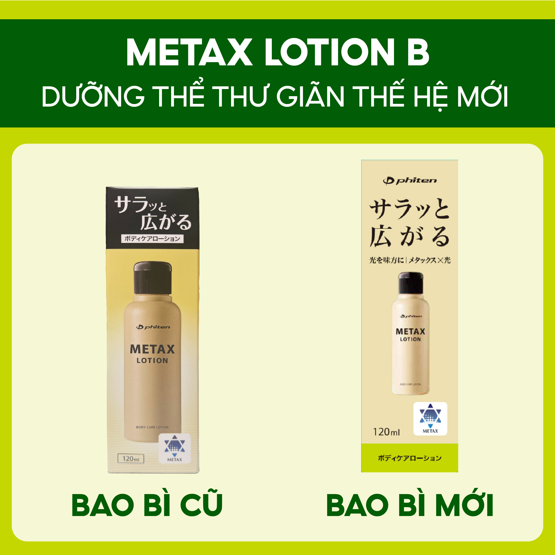 Dưỡng thể thư giãn Phiten Metax Lotion B SKU: EY187000 Phiten Metax Lotion B là một loại dưỡng thể thế hệ mới giúp thư giản cơ bắp tức thì. Metax Lotion được sử dụng phổ biến tại Nhật