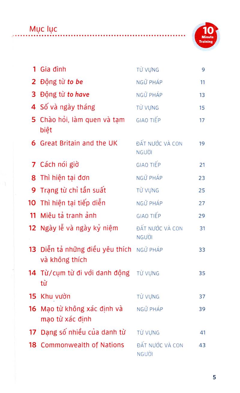 Sách có tổng cộng 71 bài và tập trung vào những chủ đề quan trọng nhất nhằm giúp bạn ôn tập từ vựng tiếng Anh cùng kiến thức về ngữ pháp cơ bản, thực hành giao tiếp, đồng thời hiểu thêm về đất nước và con người của các nước nói tiếng Anh.