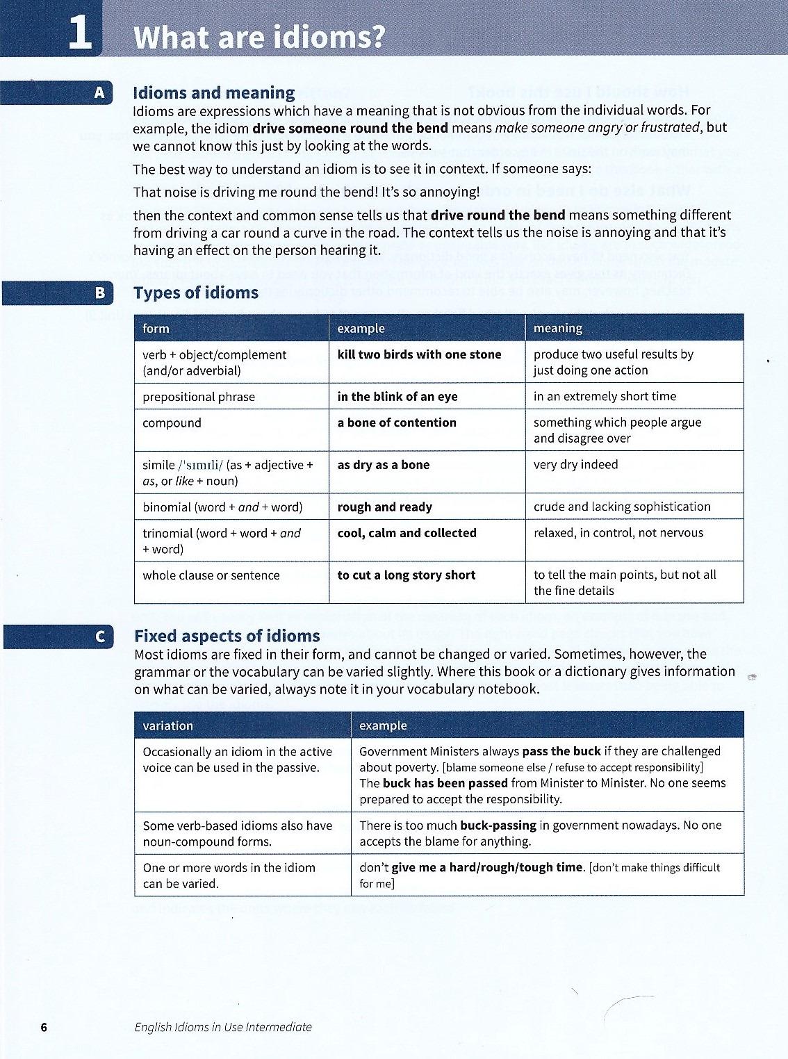 Improve your understanding of idioms in English. Explanations and practice of English idioms, written for intermediate-level (B1 to B2) learners of English. Perfect for both self-study and classroom activities. Learn idioms in context, with lots of different topics, including 'Clothes', 'Music and theatre' and 'Work'. Be confident about what you are learning, thanks to Cambridge research into how English is really spoken and written, and get better at studying by yourself, with study tips, follow-up tasks and an easy to use answer key.