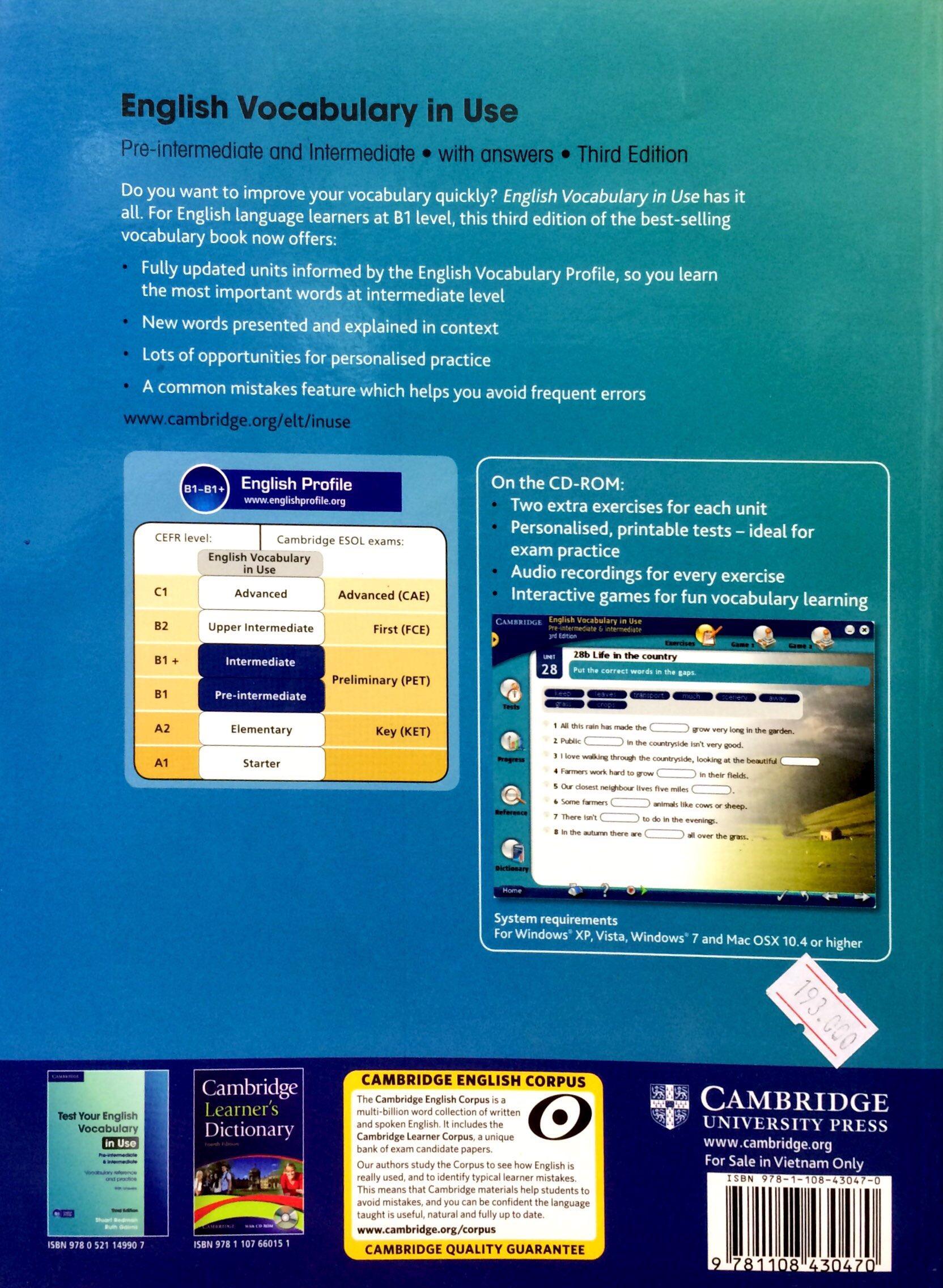 Mua tại TiktokVocabulary explanations and practice for pre-intermediate level (B1) learners of English. Perfect for both self-study and classroom activities. Quickly expand your vocabulary with over 100 units of easy to understand explanations and practice exercises. Be confident about what you are learning, thanks to Cambridge research into how English is really spoken and written, and get better at studying by yourself, with units on learning vocabulary, personalised practice and an easy to use answer key .