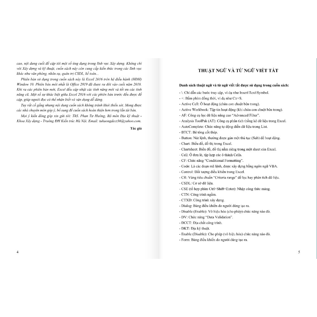 Excel là phần mềm mạnh mẽ về bảng tính, xử lý dữ liệu, biểu đồ và được sử dụng rất phổ biến trong nhiều ngành nghề. Phần mềm này không thể thiếu được trong nhiều lĩnh vực như Xây dựng, Giao thông, Khai thác Mỏ, Địa chất, Thủy lợi, Tài chính, Kế toán, Văn phòng, Thống kê Tuy nhiên phần lớn chúng ta chỉ mới khai thác ở mức độ giới hạn mặc dù tiềm năng của Excel rất lớn. Nhiều ứng dụng nâng cao, chức năng chuyên sâu giúp quá trình tính toán, xử lý những bài toán phức tạp một cách nhanh chóng, chính xác. Nguồn tài liệu về Excel tuy nhiều nhưng chủ yếu đề cập đến các tính năng cơ bản, nội dung nâng cao cho các chuyên ngành ít được đề cập một cách hệ thống. Do vậy tài liệu này cung cấp các kiến thức Excel nâng cao và hướng dẫn ứng dụng trong lĩnh vực Xây dựng là cần thiết, giúp người dùng làm việc chủ động, hiệu quả hơn. Hơn nữa, Microsoft còn hỗ trợ người dùng Excel nói riêng và Office nói chung tự động hóa công việc bằng ngôn ngữ lập trình ứng dụng VBA. Kiến thức về VBA rất rộng lớn và chỉ đề cập ở mức độ giới hạn trong cuốn sách này nhằm hỗ trợ giải quyết một số tình huống nhất định.