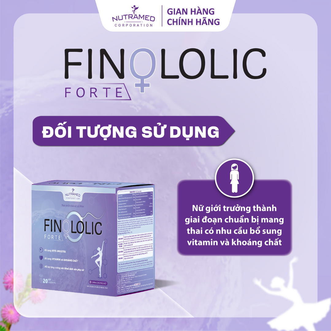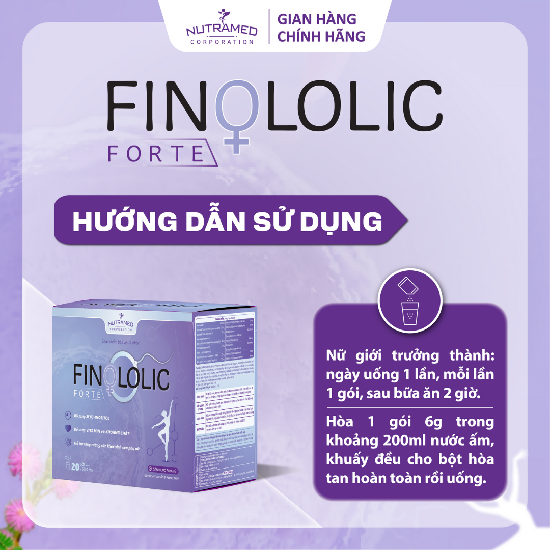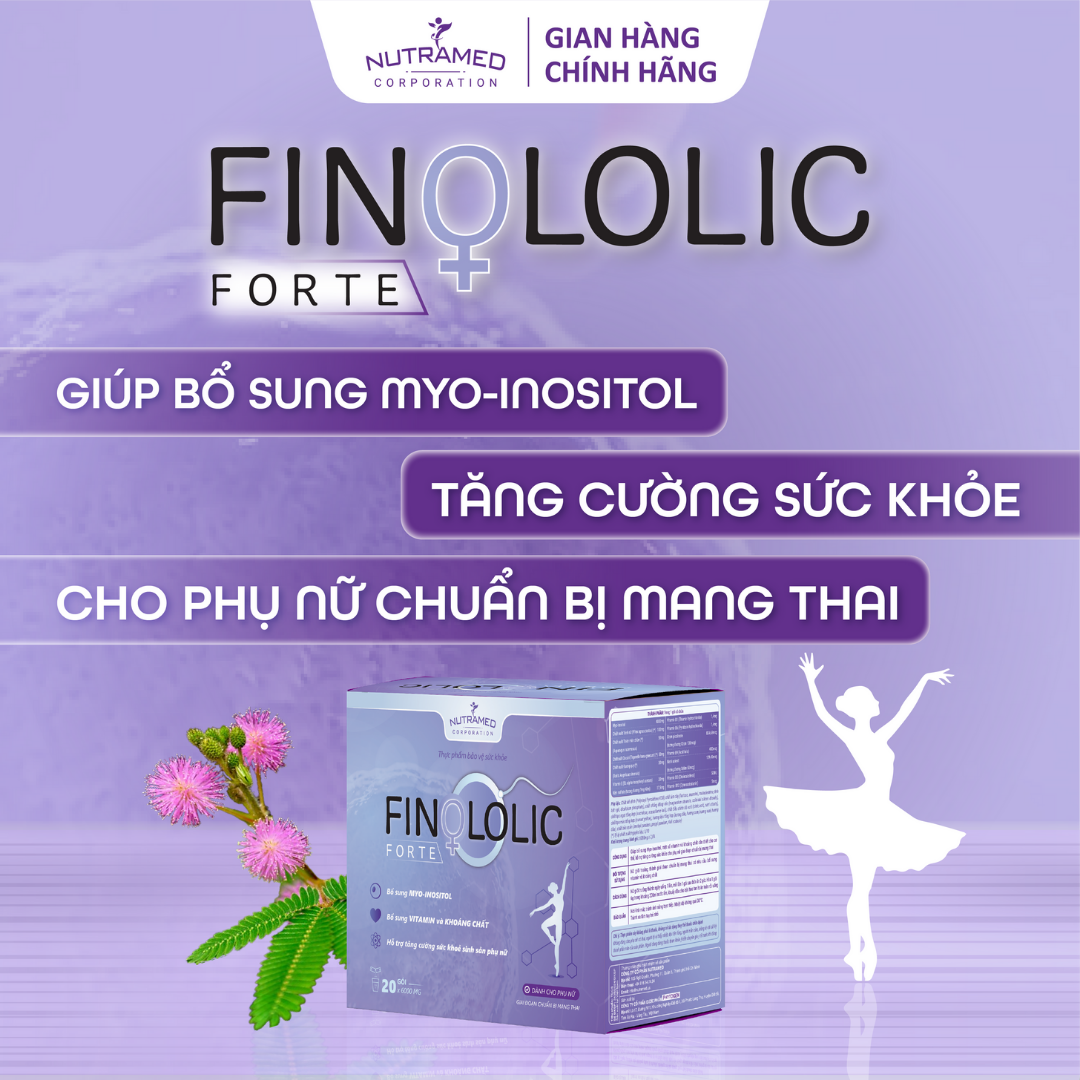 THÀNH PHẦN ️ Myo-inositol, Chiết xuất Trinh nữ (Vitex agnus castus extract), Chiết xuất Thiên môn chùm (Asparagus racemosus extract), Chiết xuất Cỏ cà ri (Trigonella foenum - graecum extract), Chiết xuất Đương quy (Radix Angelicae sinensis extract), Vitamin B1 (Thiamin hydrochloride), Vitamin B6 (Pyridoxin hydrochloride), Vitamin B9 (Acid folic), Vitamin B12 (Cyanocobalamin), Vitamin D3 (Cholecalciferol), Vitamin E (DL-alpha-tocopheryl acetate), Kẽm sulfate (tương đương Kẽm 7mg), Crom picolinate (tương đương Crom 100mcg), Natri selenite (tương đương Selen 50mcg)   CÔNG DỤNG ️Giúp bổ sung Myo-inositol, một số vitamin và khoáng chất cần thiết cho cơ thể, hỗ trợ tăng cường sức khỏe cho phụ nữ giai đoạn chuẩn bị mang thai.   ĐỐI TƯỢNG SỬ DỤNG ️ Nữ giới trưởng thành giai đoạn chuẩn bị mang thai có nhu cầu bổ sung vitamin và khoáng chất.   HƯỚNG DẪN SỬ DỤNG ️ Nữ giới trưởng thành: ngày uống 1 lần, mỗi lần 1 gói, sau bữa ăn 2 giờ. ️ Hòa 1 gói 6g trong khoảng 200ml nước ấm, khuấy đều cho bột hòa tan hoàn toàn rồi uống.   KHÔNG SỬ DỤNG TRONG TRƯỜNG HỢP ️ Phụ nữ có thai. ️ Người tỳ vị thấp nhiệt, đại tiện lỏng. ️ Người mẫn cảm, kiêng kị với bất kỳ thành phần nào của sản phẩm.   LƯU Ý ️ Người đang dùng thuốc tham khảo ý kiến chuyên gia y tế trước khi dùng.  ️ Thực phẩm này không phải là thuốc, không có tác dụng thay thế thuốc chữa bệnh. BẢO QUẢN ️ Nơi khô mát, tránh ánh nắng trực tiếp. Nhiệt độ không quá 30°C. Tránh xa tầm tay trẻ nhỏ. THÔNG TIN SẢN PHẨM Sản phẩm: Finololic Forte Quy cách đóng gói: Hộp 20 gói x 6000mg Hạn sử dụng: 36 tháng kể từ ngày sản xuất. Tiêu chuẩn: TCCS   Nutramed - Khơi Nguồn Khoa Học Tới Cuộc Sống Nhà máy đạt chuẩn WHO – GMP, nguyên liệu kiểm tra chất lượng nghiêm ngặt, đảm bảo an toàn và hiệu quả.