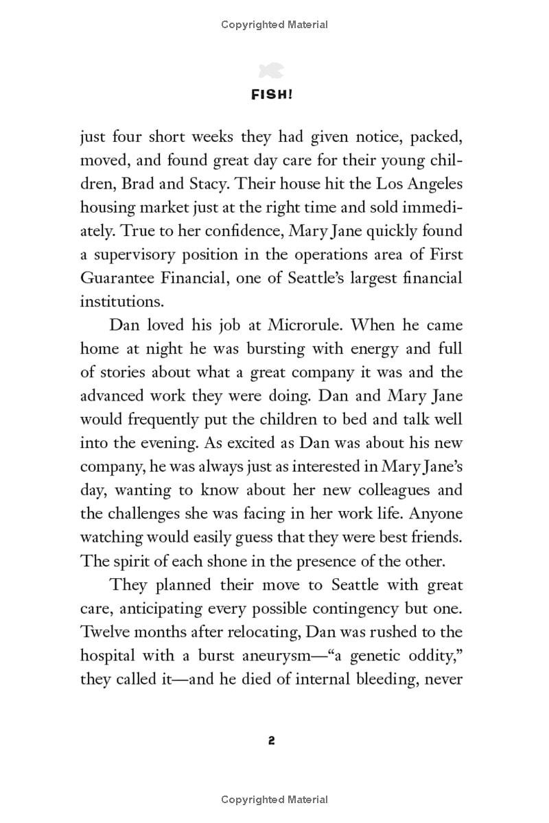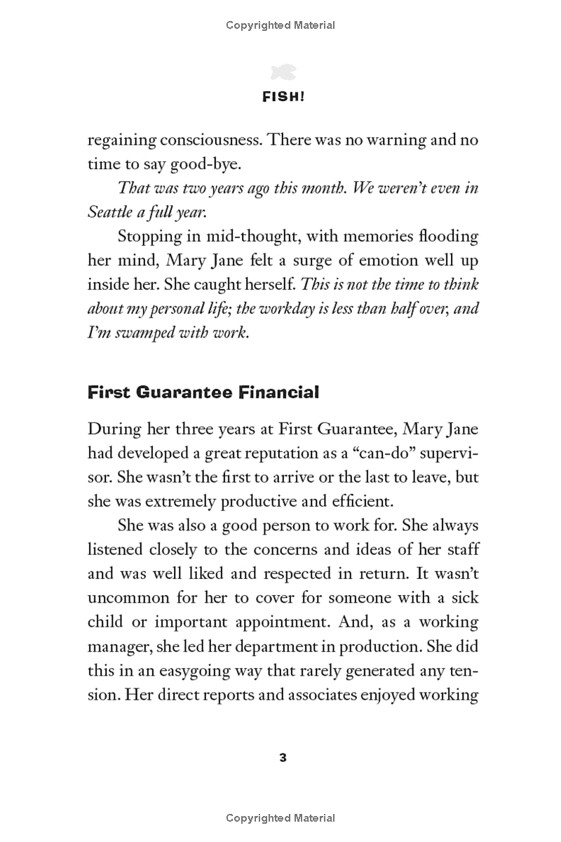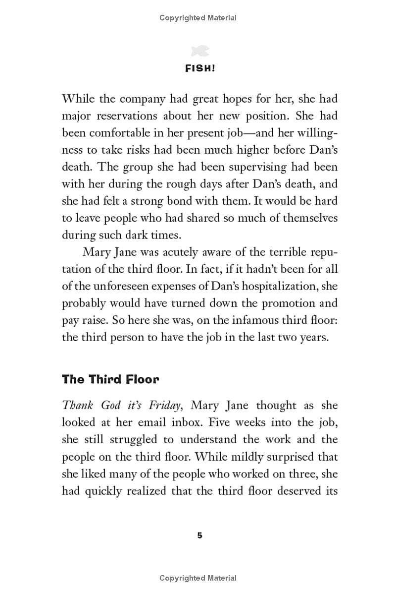 FISH! is the remarkable story of what happens when Mary Jane seeks the help of these unlikely business "experts" and learns their secret: four simple practices that, when applied daily, help anyone to be more energized, effective, and fulfilled.
