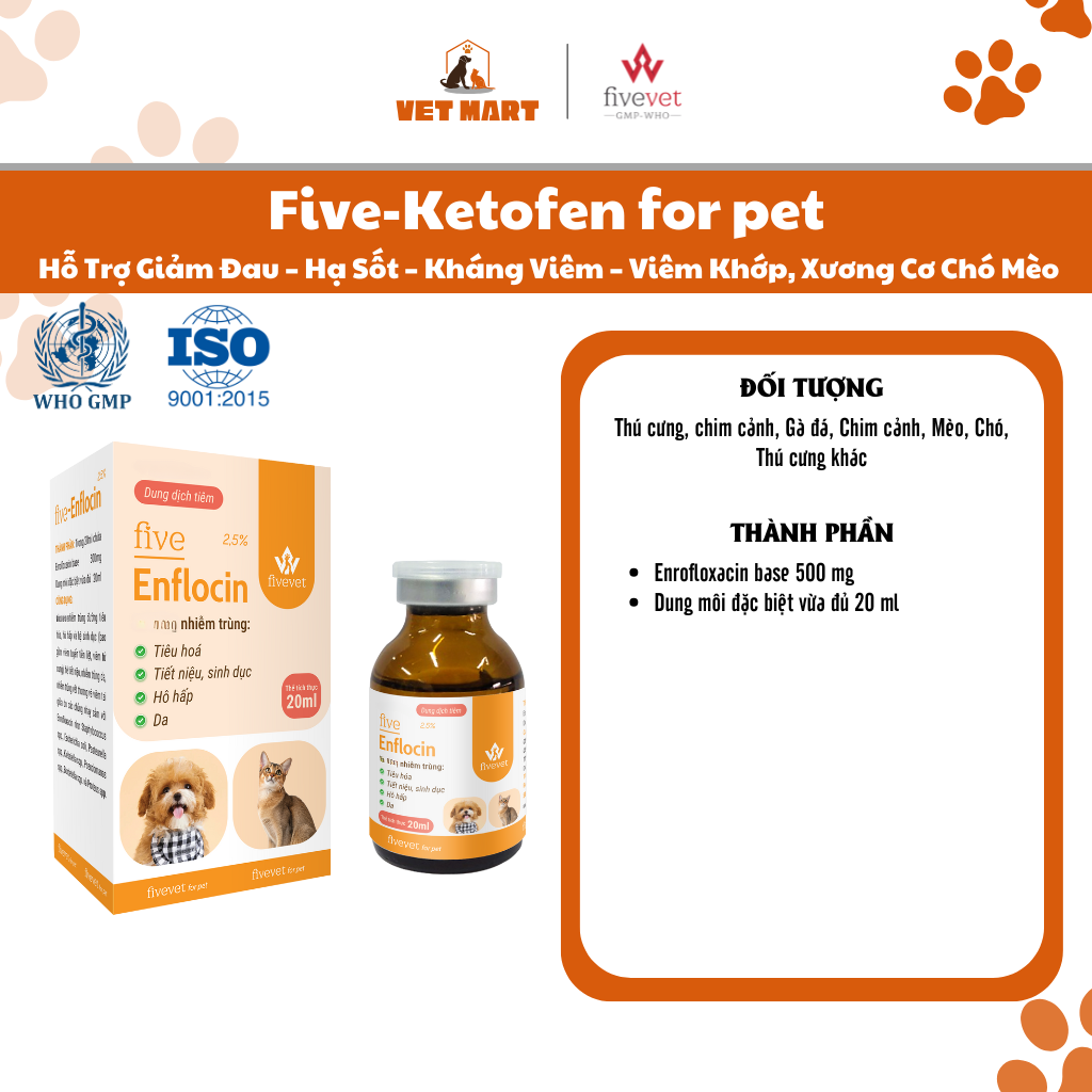 Five-Enflocin 2.5% for Pet Hỗ Trợ Hô Hấp Tiêu Hóa Da Tiết Niệu Kháng Khuẩn Toàn Diện Cho Thú Cưng THÀNH PHẦN - Enrofloxacin base 500 mg - Dung môi đặc biệt vừa đủ 20