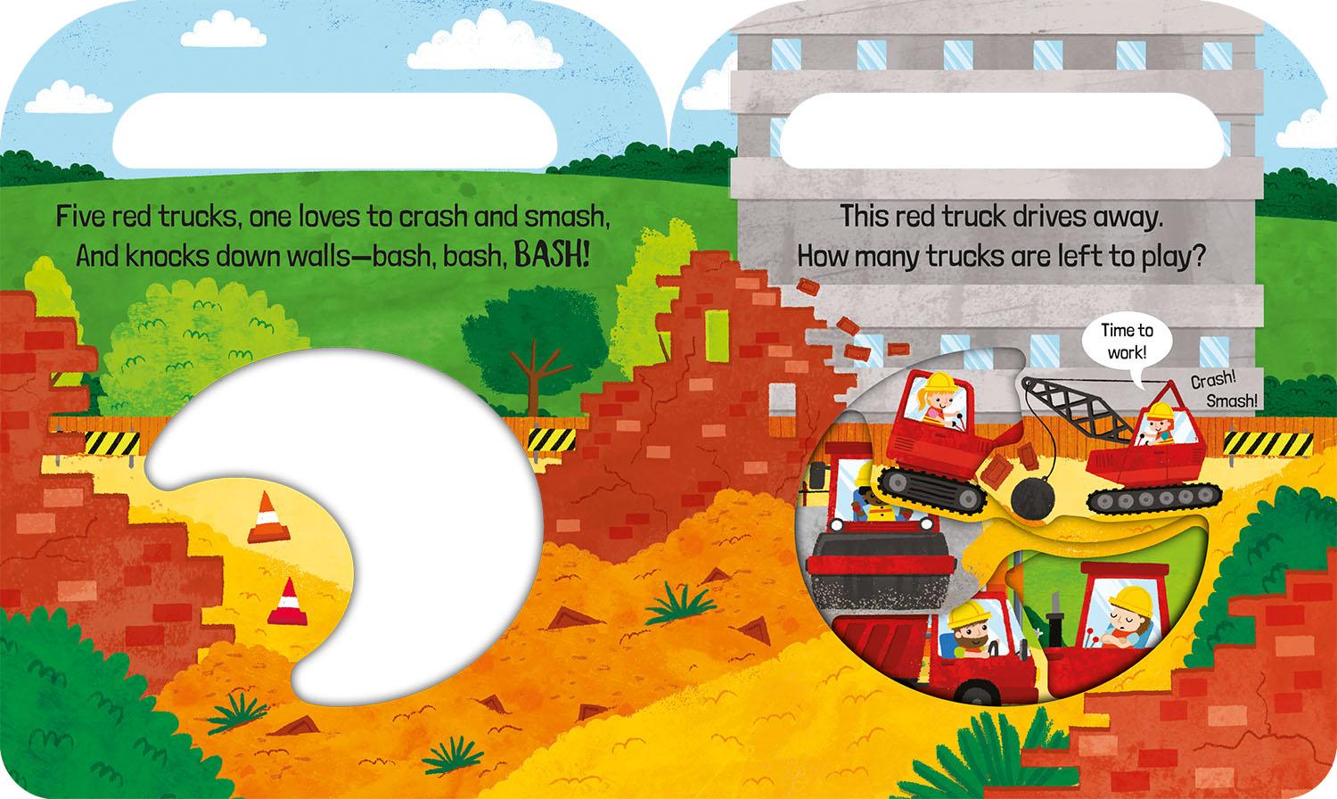 Peek through the windows to find the trucks and diggers and count from 5 to 1 in this carry handle story book that's perfect for on-the-move story time and first counting fun!