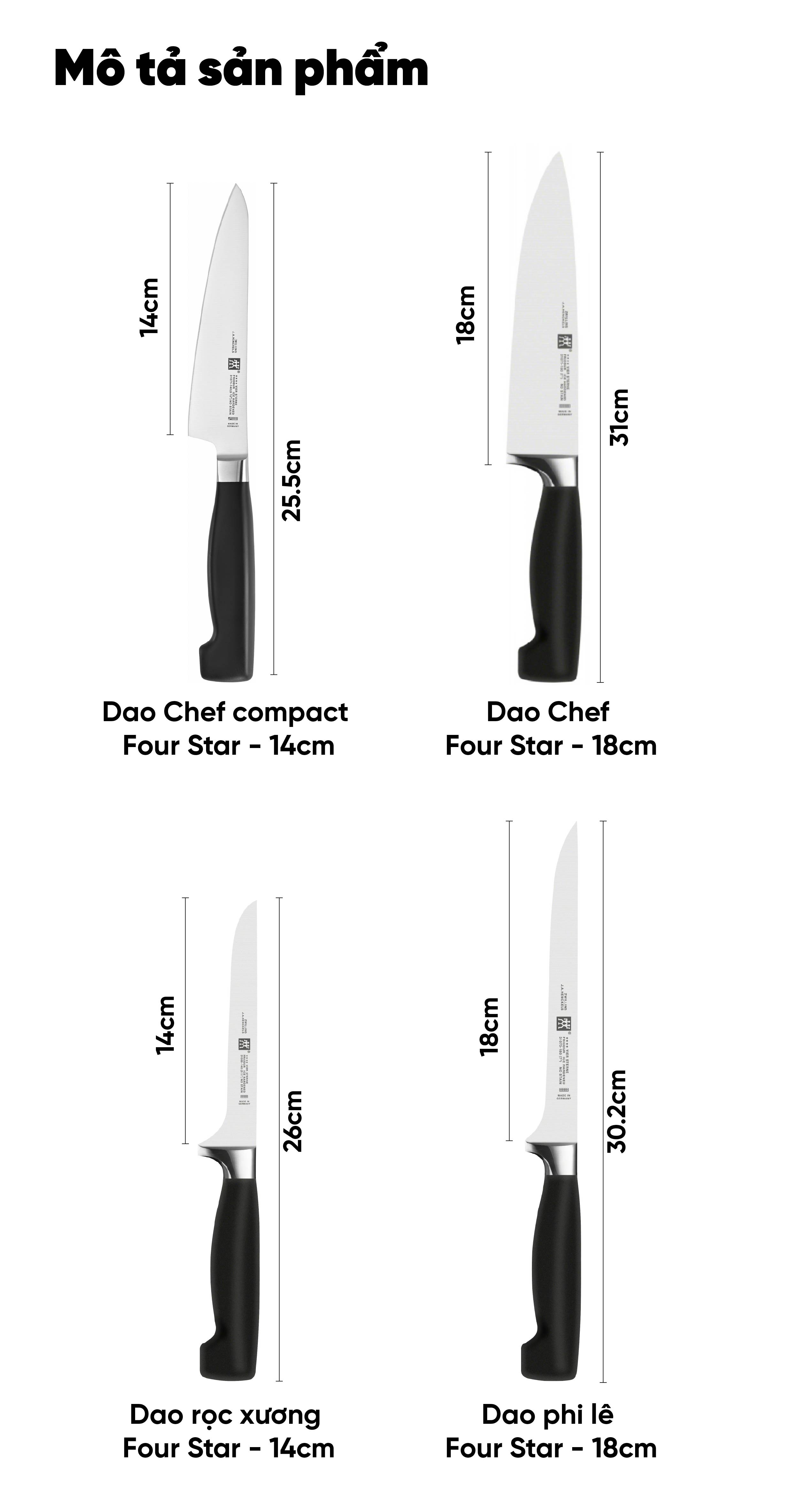 Dao Chef compact Four Star thuộc dòng dao FOUR STAR thương hiệu ZWILLING là sự kết hợp hoàn hảo giữa an toàn, tính công thái học và sự thoải mái, khiến nó trở thành dòng dao của ZWILLING bán chạy nhất trên thế giới.