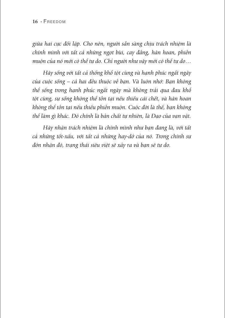 Với những chia sẻ đầy khai mở, cuốn sách “Tự do – Như chim tung cánh” giúp người đọc xác định những trở ngại đối với tự do của họ, có thể do hoàn cảnh hoặc do bản thân họ tự áp đặt, tìm thấy lòng dũng cảm để thành thật với chính m.ình. Và hãy lắng nghe lời Osho nhắn nhủ chúng ta: “Hãy sống với tất cả thống khổ tột cùng và hạnh phúc ngất ngây của cuộc sống – cả hai đều thuộc về bạn. Và luôn nhớ: Bạn không thể sống trong hạnh phúc ngất ngây mà không trải qua đau khổ tột cùng, sự sống không thể tồn tại nếu thiếu cái chết, và hân hoan không thể tồn tại nếu thiếu phiền muộn. Cuộc đời là thế, bạn không thể làm gì khác”.