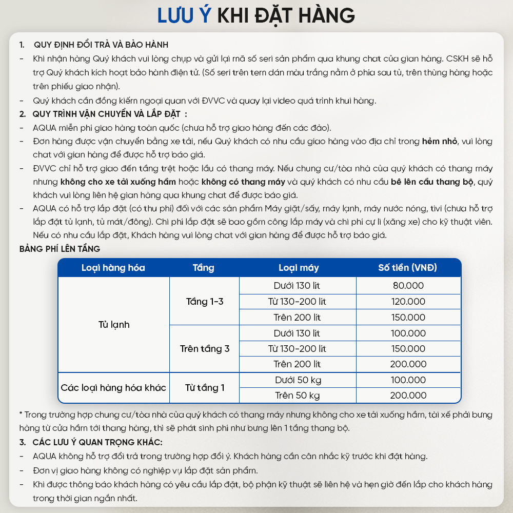Khu vực ngoại thành HCM có giao hàng tính phí, vui lòng liên hệ trước. - Lắp đặt MIỄN PHÍ ở nhà trệt / có thang máy, lên lầu thang bộ có phí. - Cần