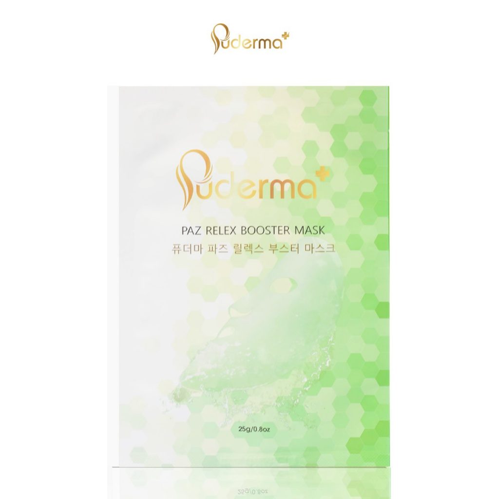 MẶT NẠ XANH PUDERMA PAZ RELEX BOOSTER MASK: dưỡng da, cung cấp độ ẩm và dưỡng chất cho da, giúp làm dịu da, ngăn ngừa nếp nhăn cho da, làm mờ vết nám, vết thâm, mang lại làn da trắng, mịn màng.