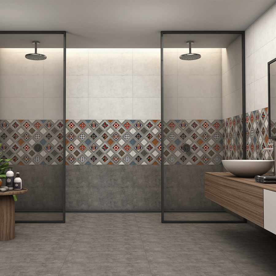 Họa tiết của gạch ốp tường là sự kết hợp giữa các tone màu xanh lam, đỏ, be, xám, trắng và nâu tạo nên một gam màu tổng thể rực rỡ và bắt mắt, nổi bật khi ốp tường trang trí. Bên cạnh đó, họa tiết là những khối hình 2D xếp trong khối vuông tạo nên những hoa văn tối giản và hiện đại giúp hài hòa và tăng tính sinh động cho không gian nội thất xung quanh.