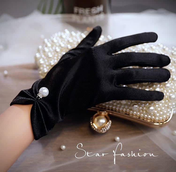 Găng tay Cô dâu và Dạ hội, đi tiệc, sự kiện. MS: 45451. Chất liệu: nhung, co giãn. Kiểu dáng: bao kín ngón, ôm tay, đính nơ và ngọc trai. Hoạ tiết: trơn. Độ dài: