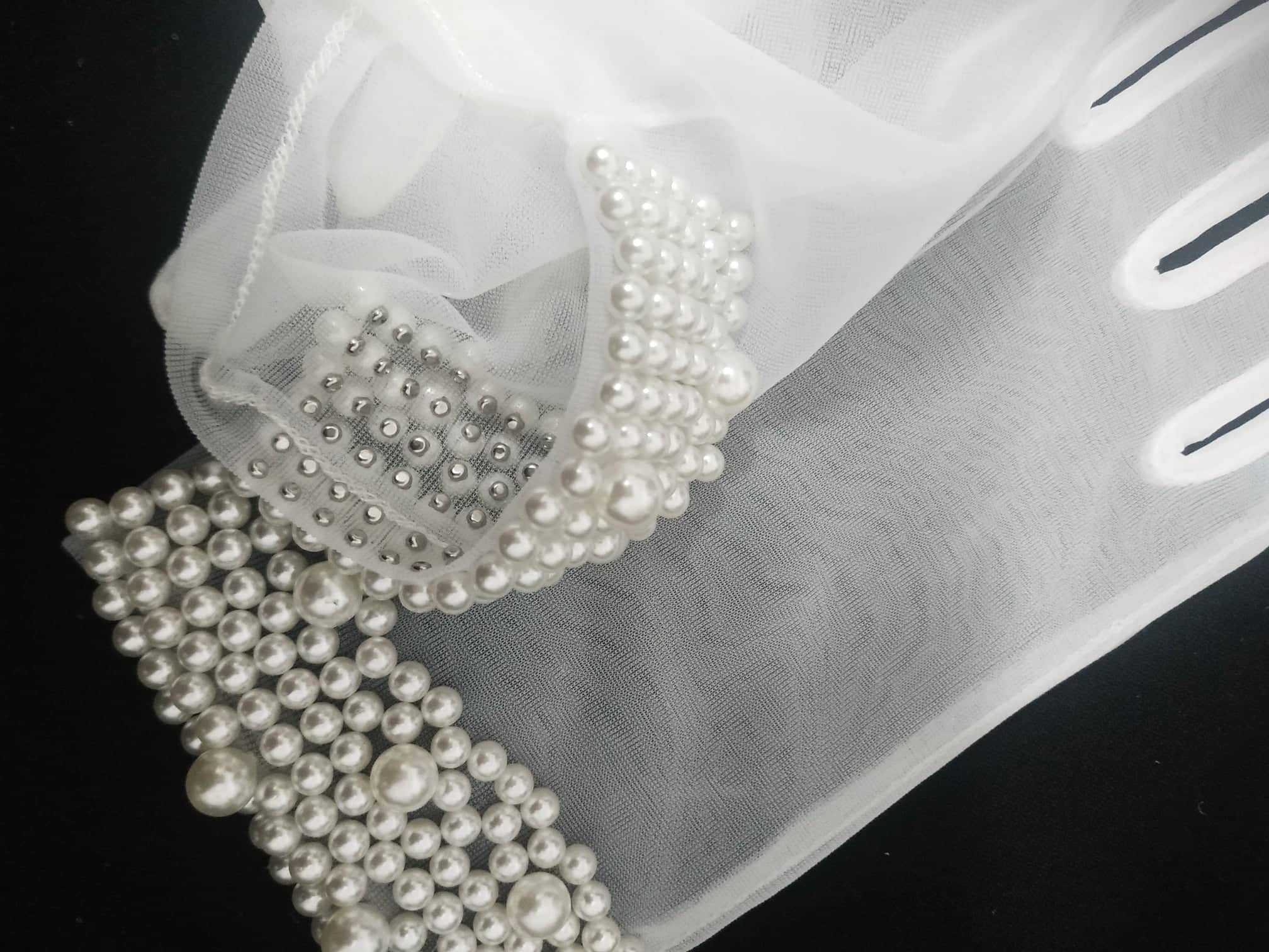Găng tay Cô dâu và Dạ hội, đi tiệc, sự kiện, lễ hội, chụp ảnh MS: 43445 Chất liệu: tuyn mềm. Kiểu dáng: bao kín ngón, trong suốt, tạo kiểu và đính hạt trai ở