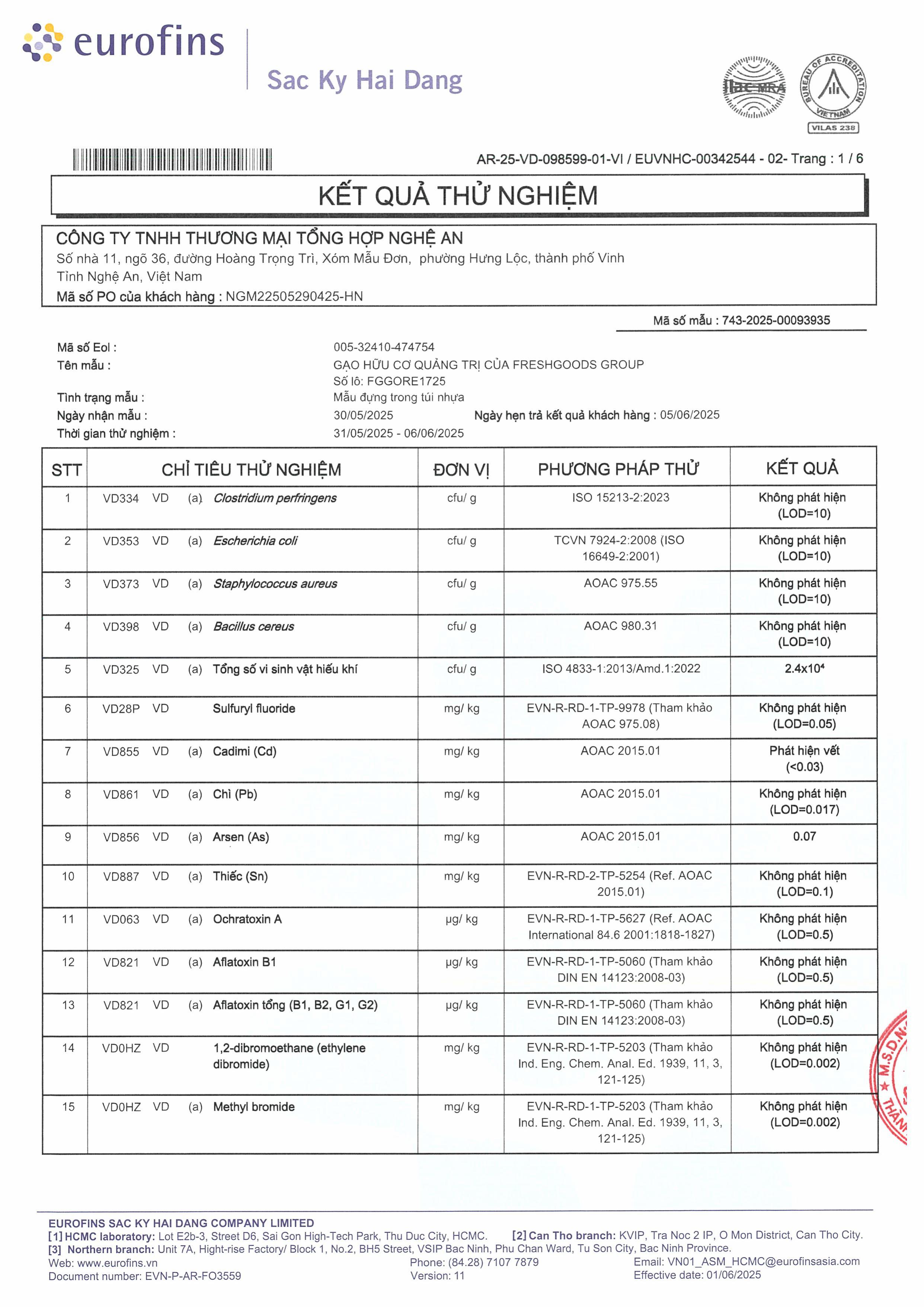 - Đảm bảo an toàn vệ sinh thực phẩm cao: • Không phát hiện hoặc phát hiện vết rất nhỏ các kim loại nặng độc hại như Chì (Pb), Thiếc (Sn), Cadimi (Cd). • Đặc biệt, không phát hiện nhiều loại thuốc bảo vệ thực vật, Aflatoxin B1, Aflatoxin tổng, và Ochratoxin A. Điều này cho thấy sản phẩm được canh tác và kiểm soát chặt chẽ, an toàn cho sức khoẻ