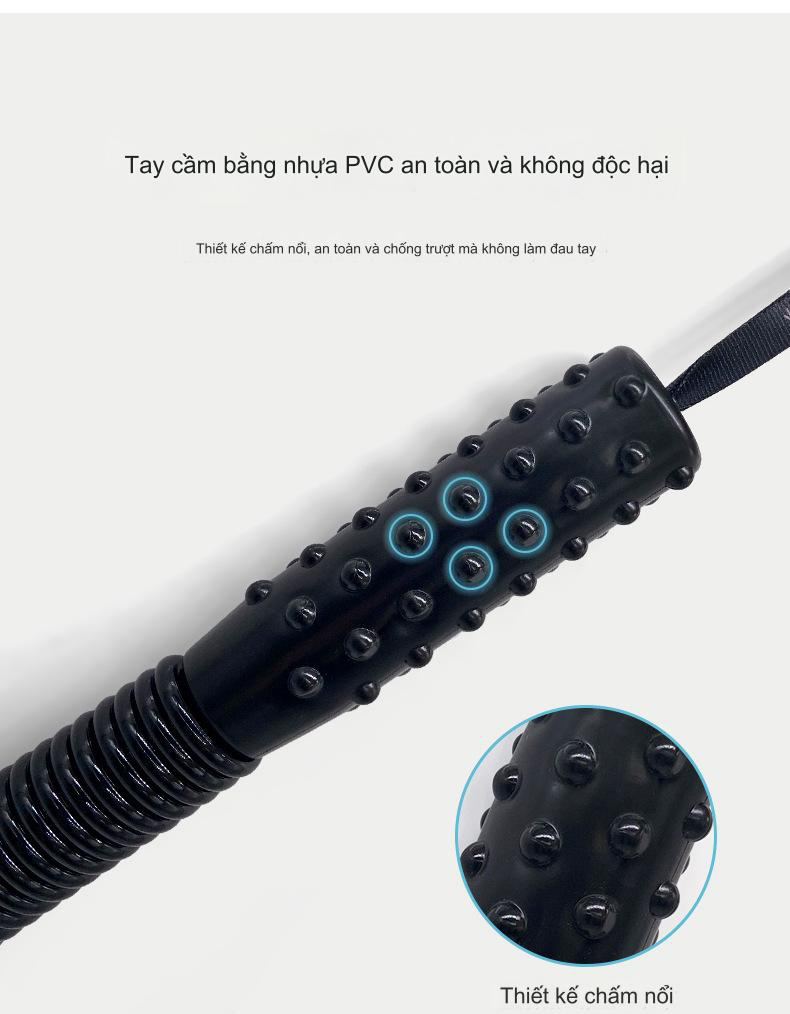 - Tay cầm chống trơn trượt dễ cầm, ở giữa thân gậy tập có thiết kế lò xo với độ đàn hồi cao để uốn cong tập các phần cơ tay sau và cơ bụng.