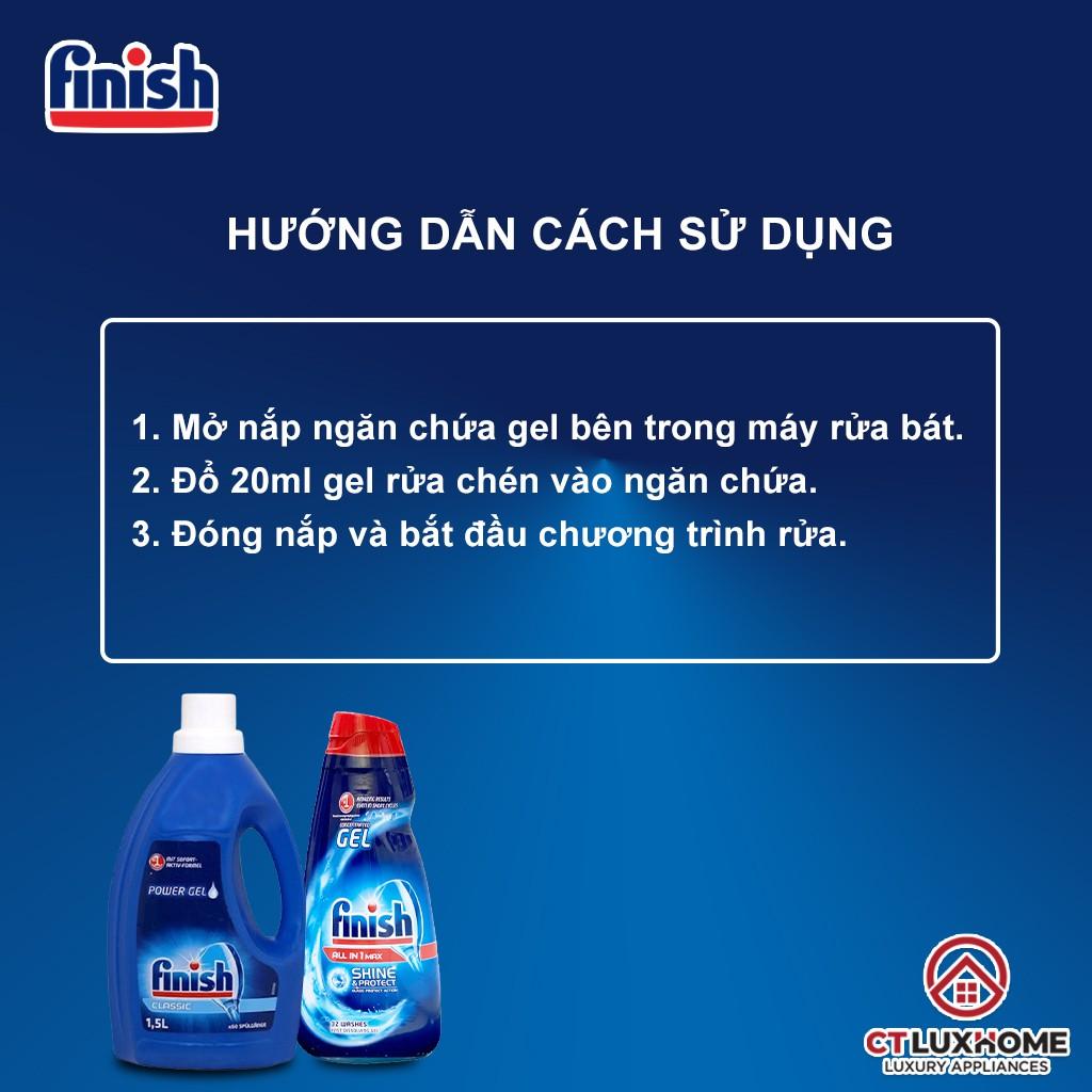Vì hợp chất rửa ở dạng gel lỏng nên Gel rửa bát Finish Eco 0% thêm có các dụng chính sau: - Giúp loại bỏ dầu mỡ, thực phẩm bám dính trên bát đĩa hiệu