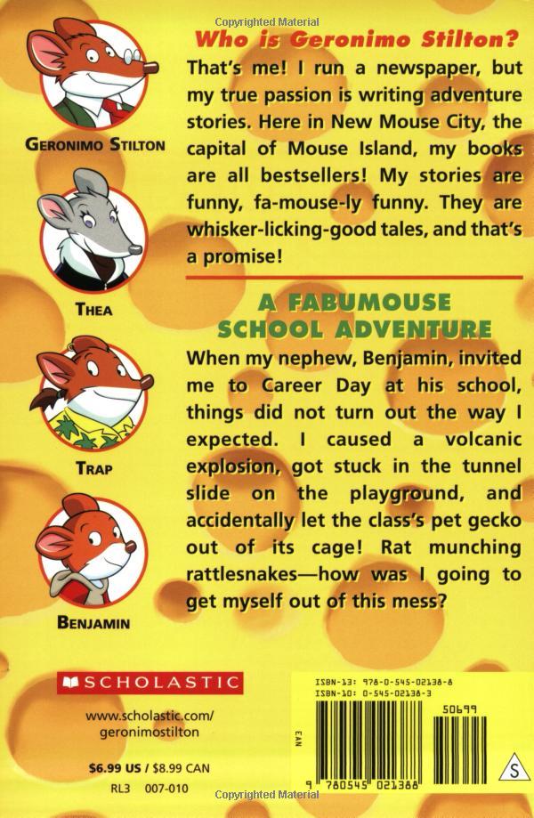 Mua tại TiktokEnter the world of Geronimo Stilton, where another funny adventure is always right around the corner. Each book is a fast-paced adventure with lively art and a unique format kids 7-10 will love. When my nephew, Benjamin, invited me to Career Day at his school, things did not turn out the way I expected. I caused a volcanic explosion, got tangled in the tunnel slide on the playground, and accidentally let the class's pet gecko out of its cage! Rat munching rattlesnakes -- how was I going to get myself out of this mess?