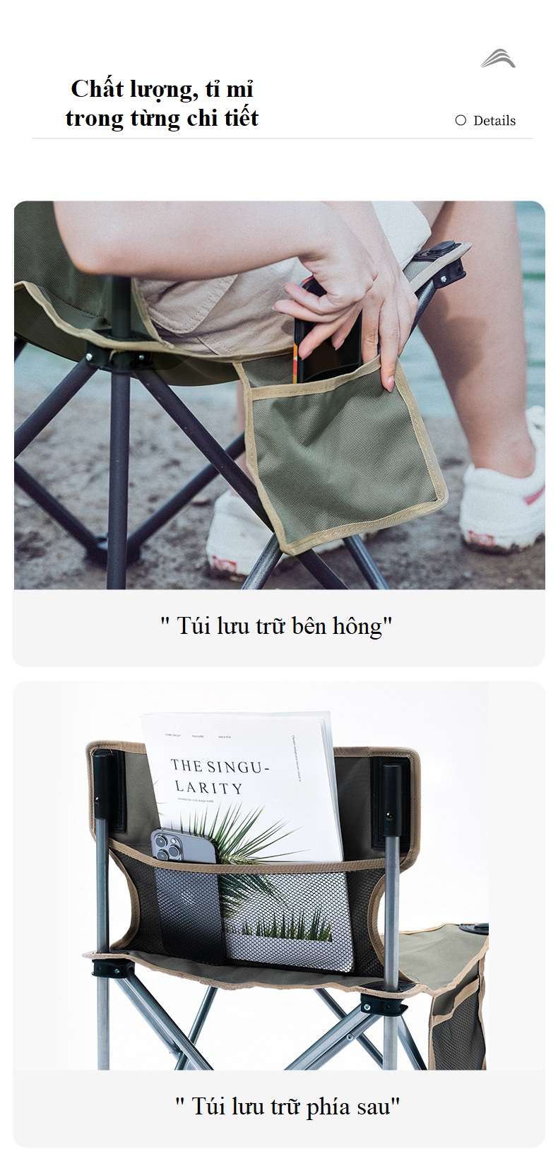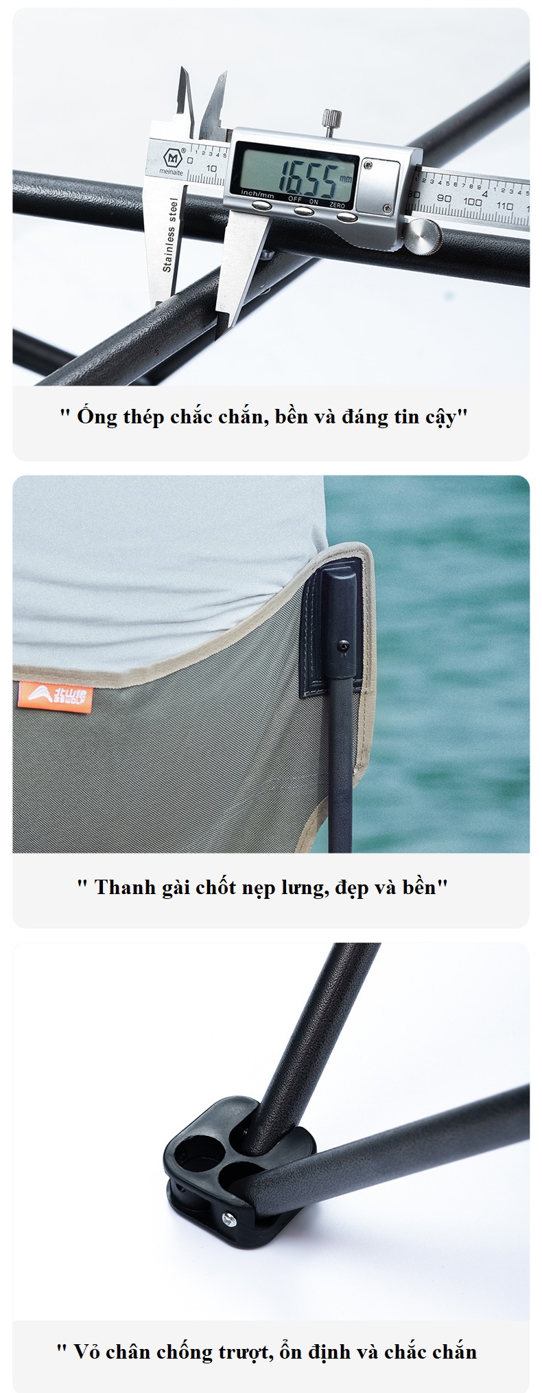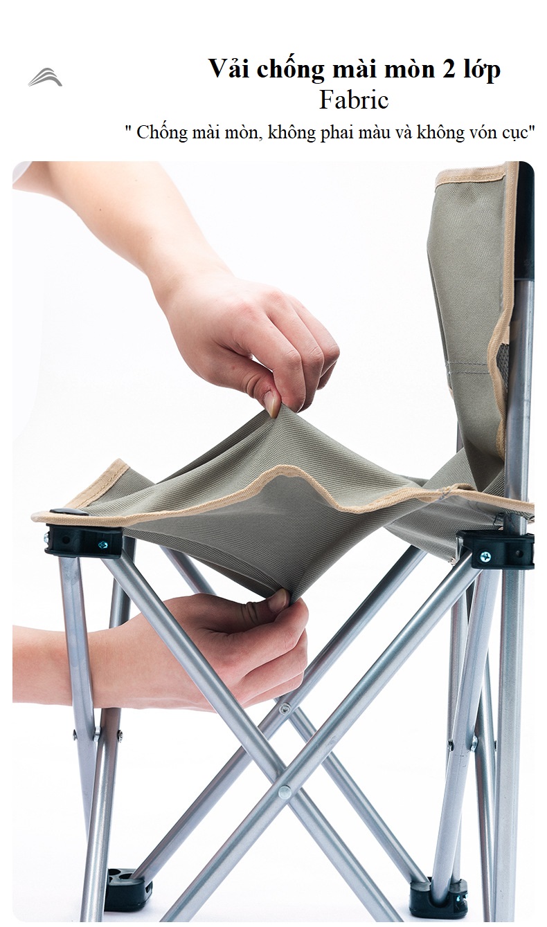 ------ Ghế Ngồi gập gọn được làm từ Chất liệu khung hợp kim nhôm sơn tĩnh điện siêu cứng, mặt ngồi bằng vải 600D Oxford cao cấp siêu êm. Khung hợp kim cứng giúp ghế