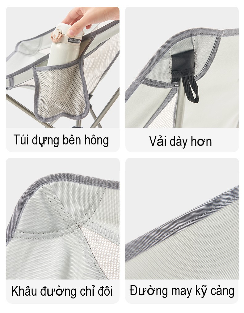 ------ Ghế Ngồi gập gọn được làm từ Chất liệu khung hợp kim nhôm sơn tĩnh điện siêu cứng, mặt ngồi bằng vải 600D Oxford cao cấp siêu êm. Khung hợp kim cứng giúp ghế