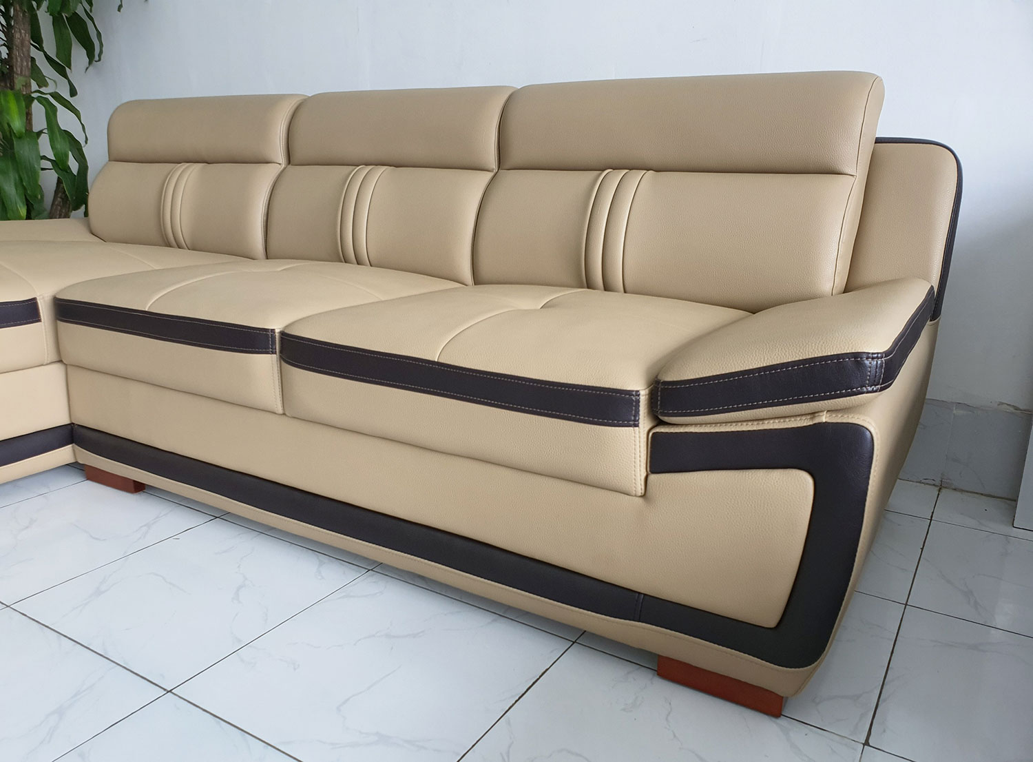 Có được một bộ ghế đẹp cho phòng khách là điều ai cũng mong muốn. Để đáp ứng nhu cầu của khách hàng chúng tôi đã cho ra đời bộ sofa với thiết kế mới nhất, mang đậm hiện đại, đẹp mắt. Bộ sofa này màu kem có viền màu nâu đen, lưng ghế có 2 đường may ở giữa chạy dọc tạo điểm nhấn, mặt ngồi của ghế được may rút nút nên khi nằm sẽ đỡ bị nóng hơn. Ghế sofa da công nghiệp cao cấp được thiết kế đơn giản theo góc nhà tạo thành hình chữ L giúp tiết kiệm diện tích và tận dụng được các góc chết của căn phòng. Tiện lợi cho cả việc tiếp khách lẫn thư giãn, đọc sách, xem phim,